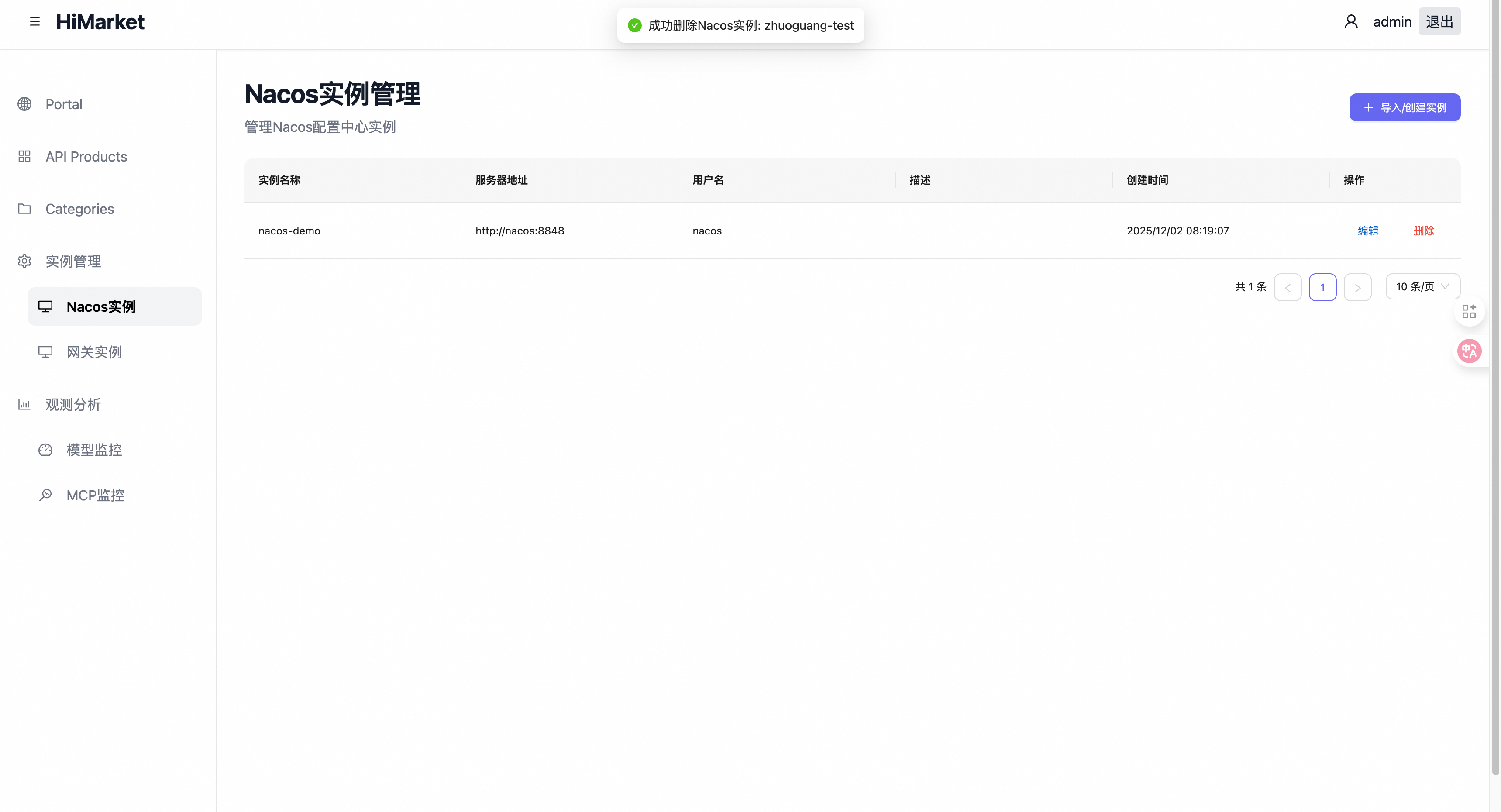 登录 HiMarket Admin 后台,进入 “Nacos实例管理” 页面。
