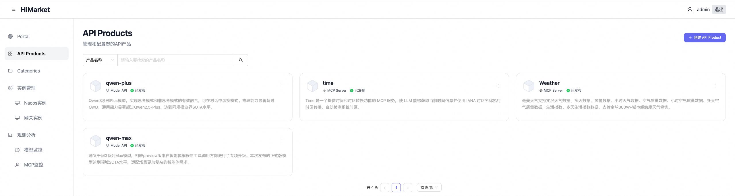- HiMarket:API 和 Agent 产品管理平台,提供统一的展示和管理门户