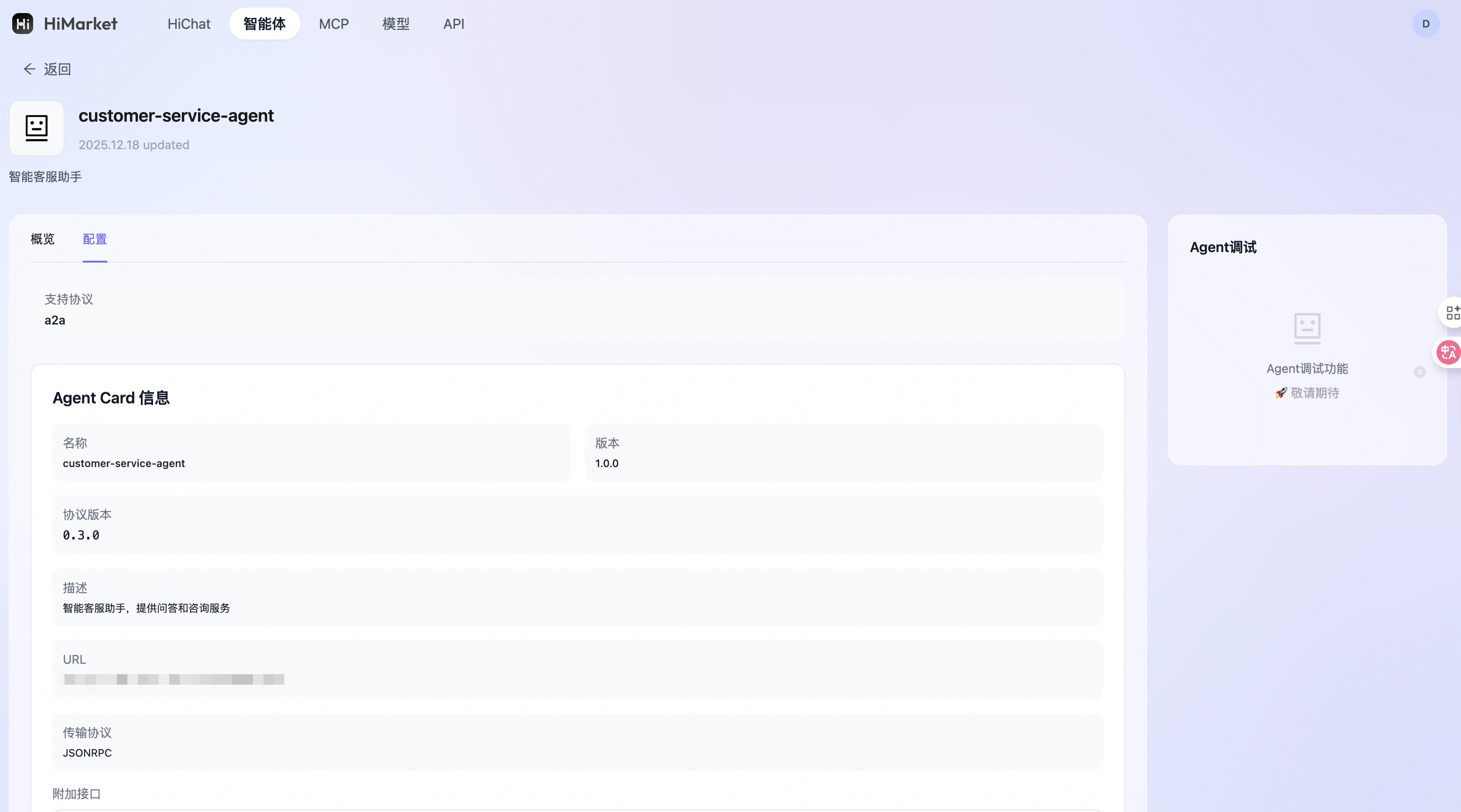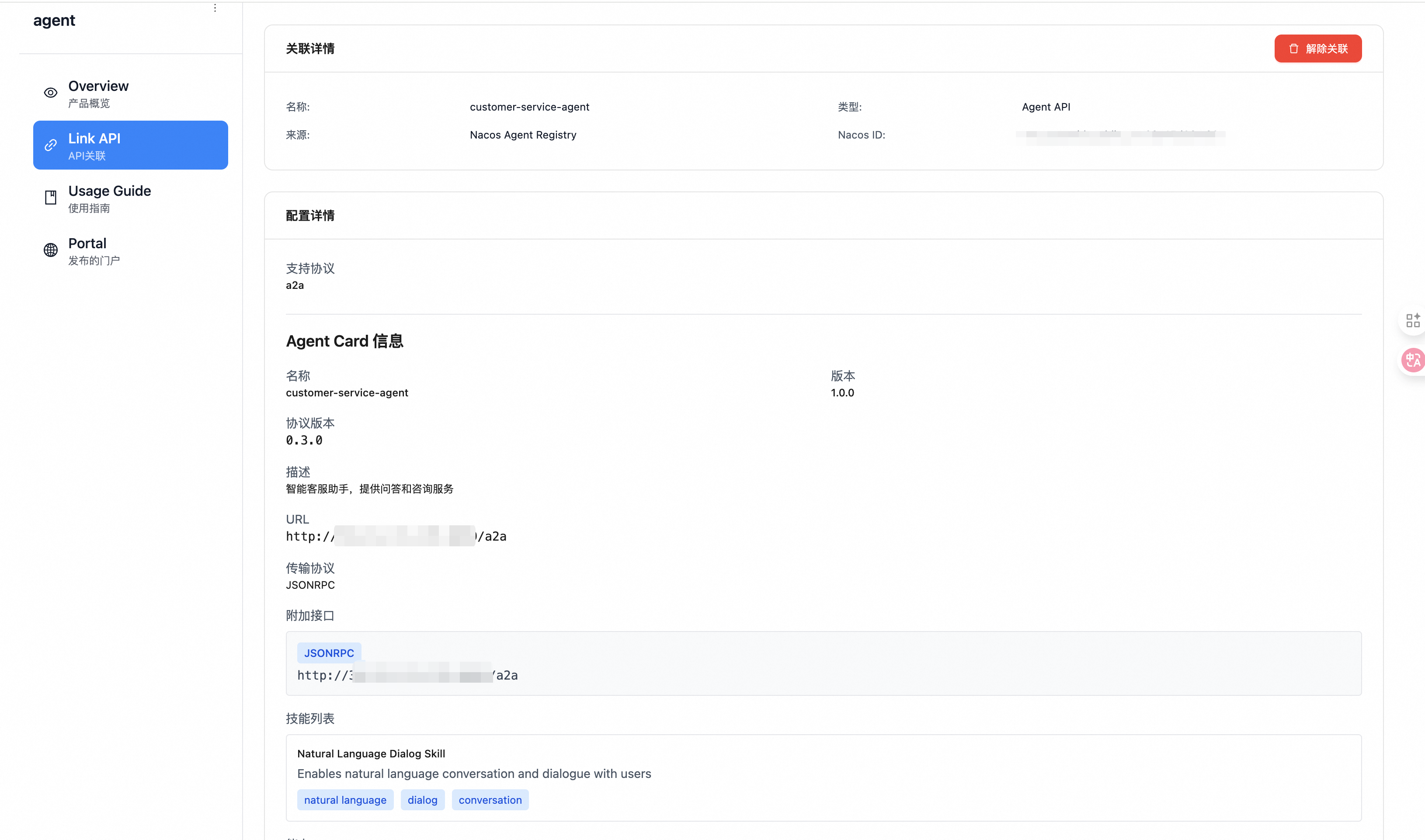 - 配置标签:查看 Agent Card、协议、路由等技术信息