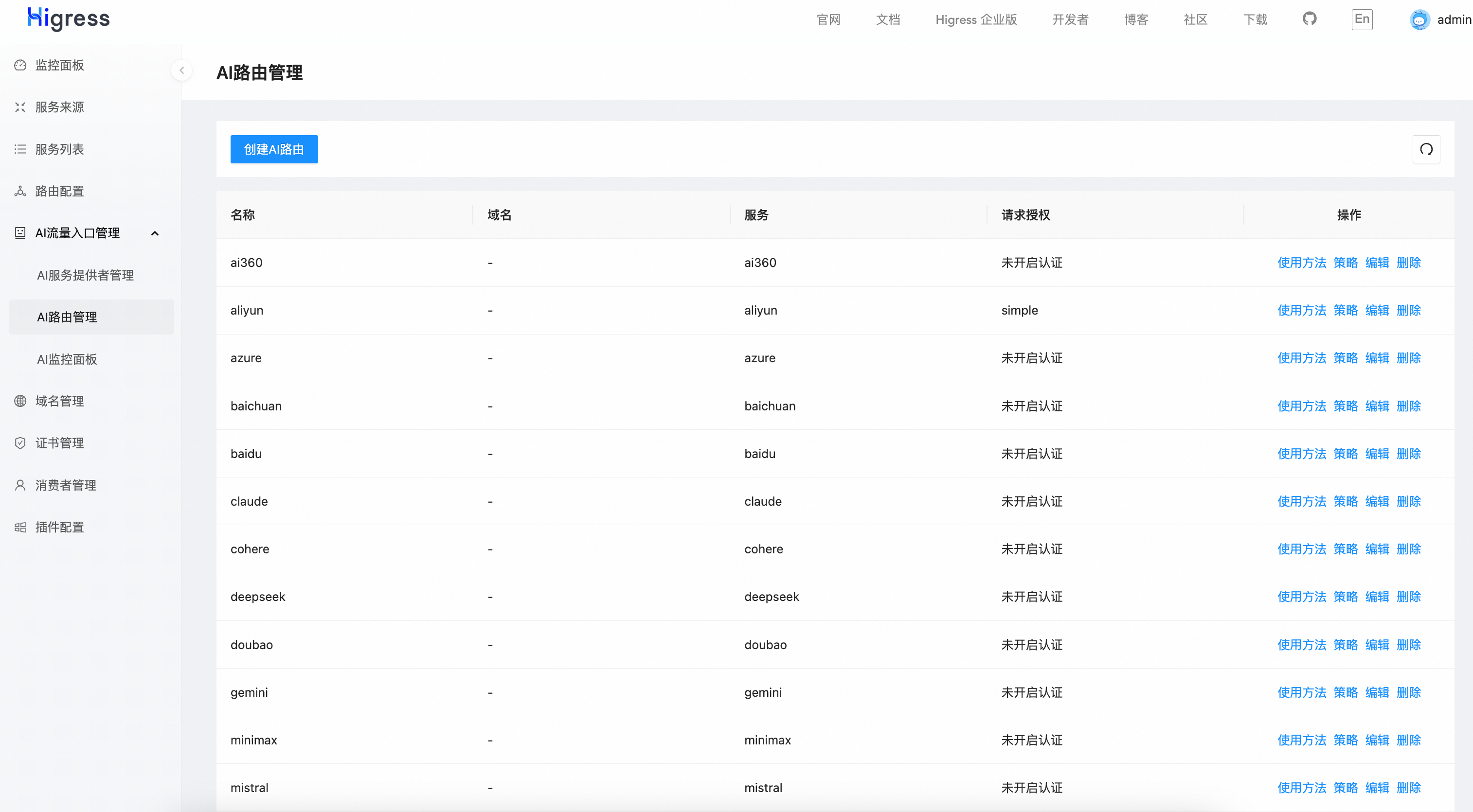 在AI路由管理界面,支持配置不同路由的域名、模型匹配方式、降级配置、请求消费者等。也可以通过策略,配置不同认证鉴权方式、限流策略等,也支持如 RAG、Prompt 模板、语义缓存等功能。