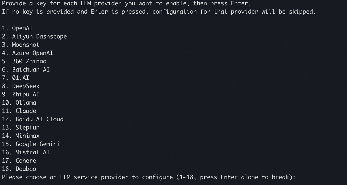 按照指引可以分别录入 Aliyun Dashscope或其他API-KEY;也可以键入回车后跳过,之后在控制台中修改。