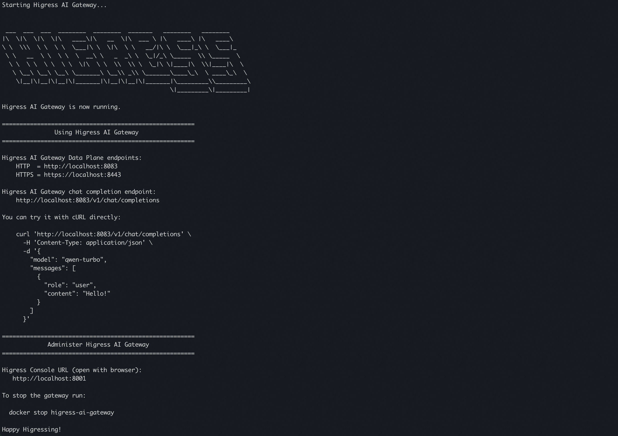 curl -sS https://higress.cn/ai-gateway/install.sh | bash注意:AI 网关的启动过程需要访问公网资源。请确保其运行环境具备外网访问条件。