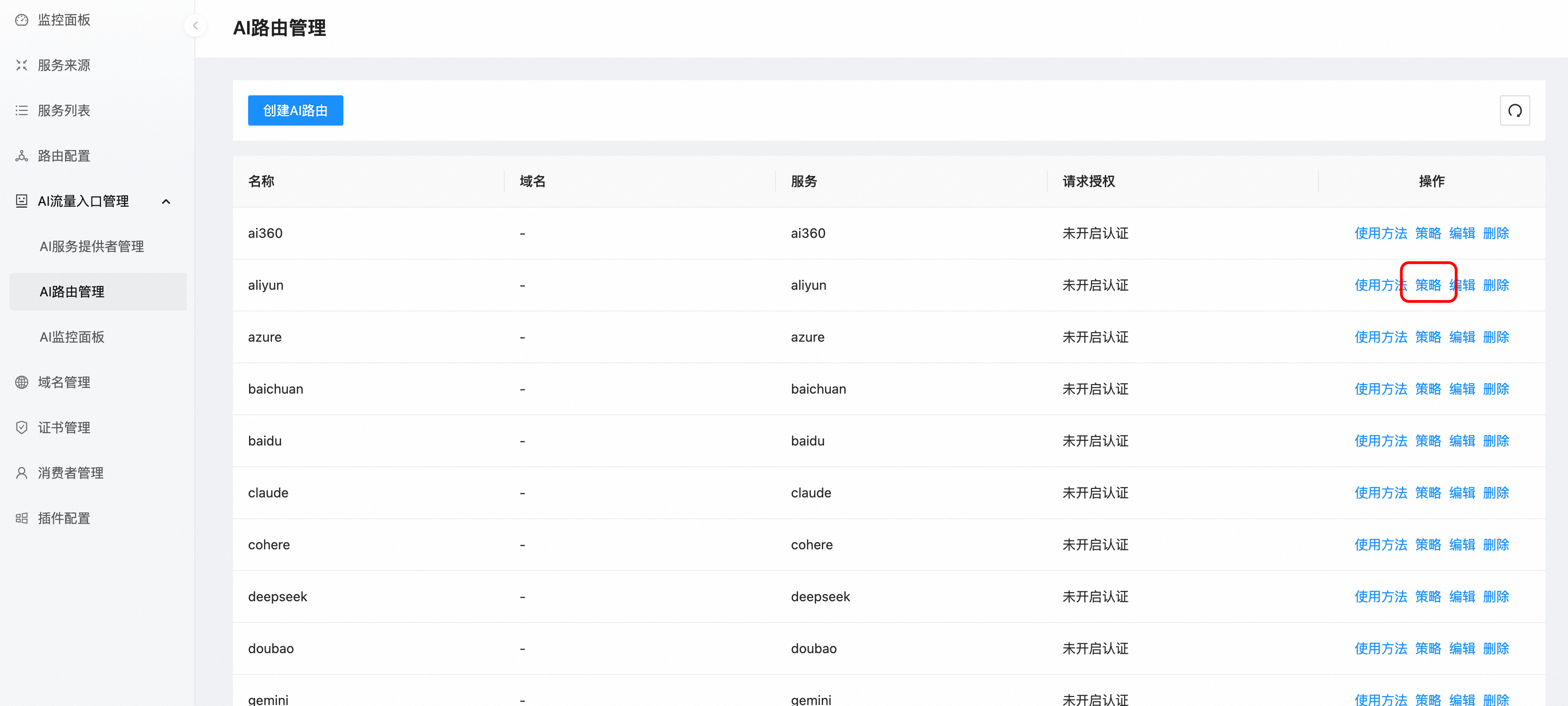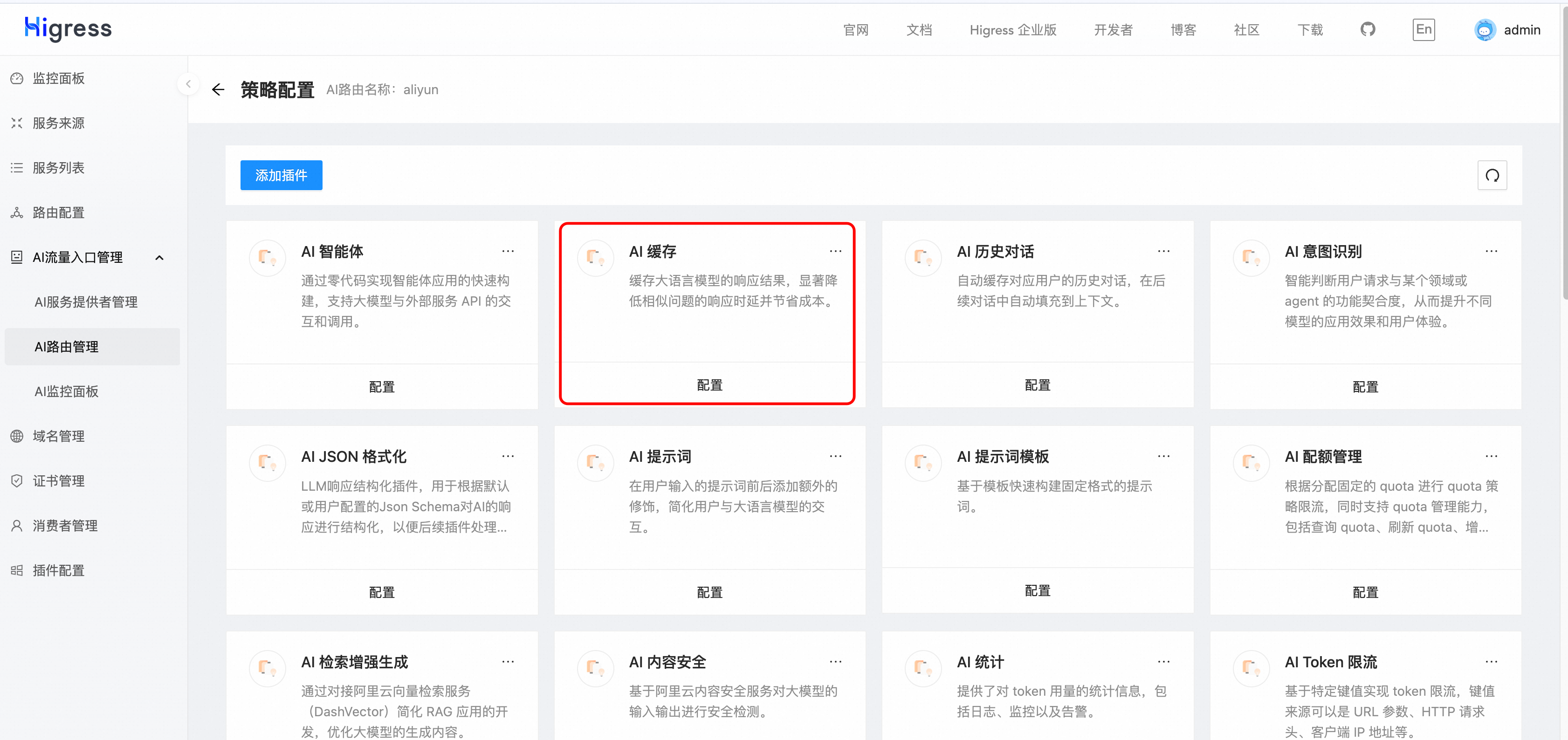 在AI路由管理界面中,为阿里云配置插件策略,选择AI缓存。