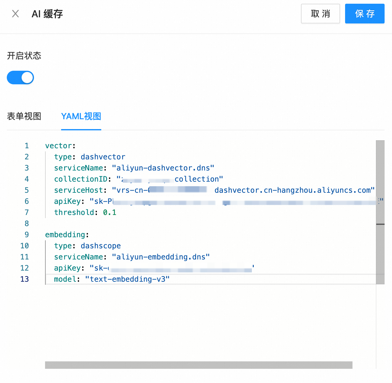 vector: type: dashvector serviceName: "aliyun-dashvector.dns" collectionID: "XXXXX" #存储向量的collection名称 serviceHost: "vrs-cn-xxxxxx.dashvector.cn-hangzhou.aliyuncs.com" #存储cluster的端点地址 apiKey: "sk-xxxxxxxxxxxxxxxxxx" #向量检索api-key threshold: 0.12