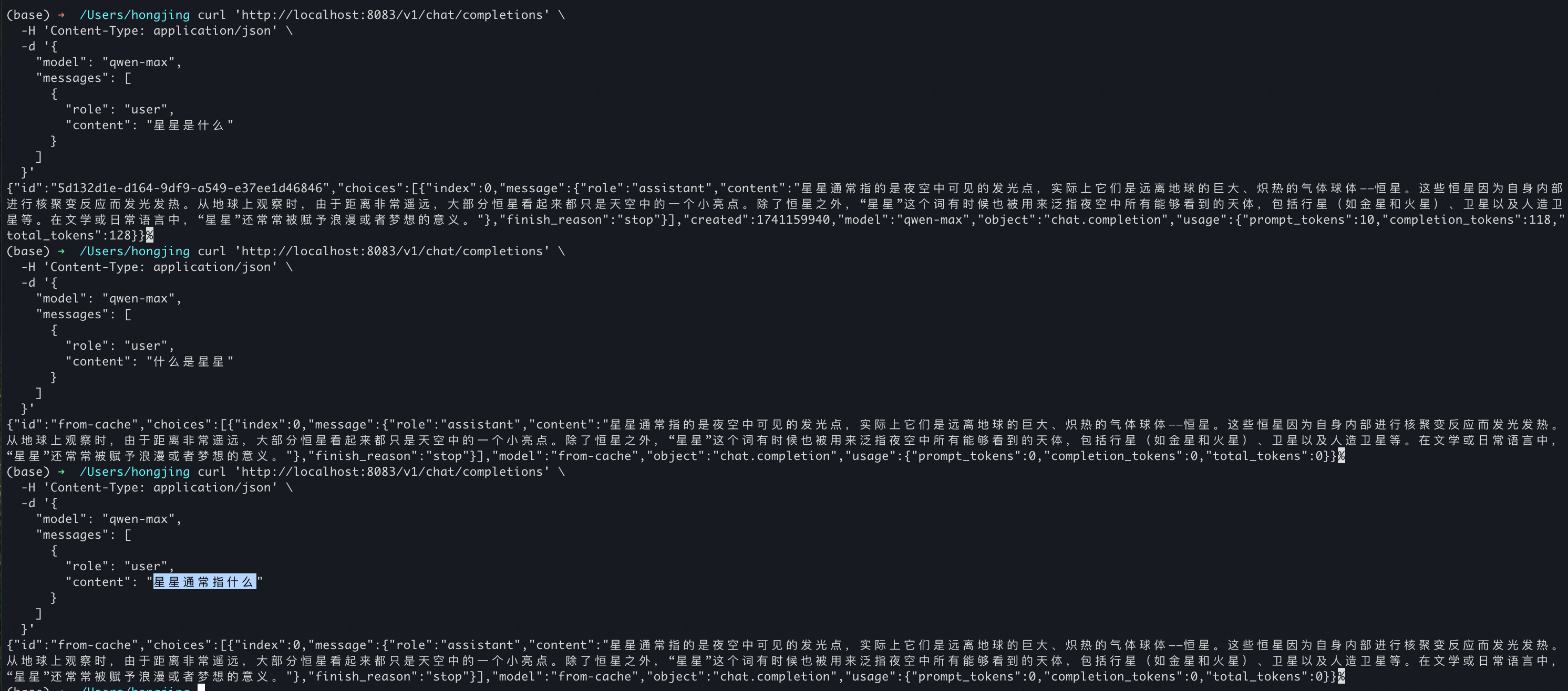 curl 'http://localhost:8080/v1/chat/completions' \ -H 'Content-Type: application/json' \ -d '{ "model": "qwen-max", "messages": [ { "role": "user", "content": "星星是什么" } ] }'可以尝试以下问题: