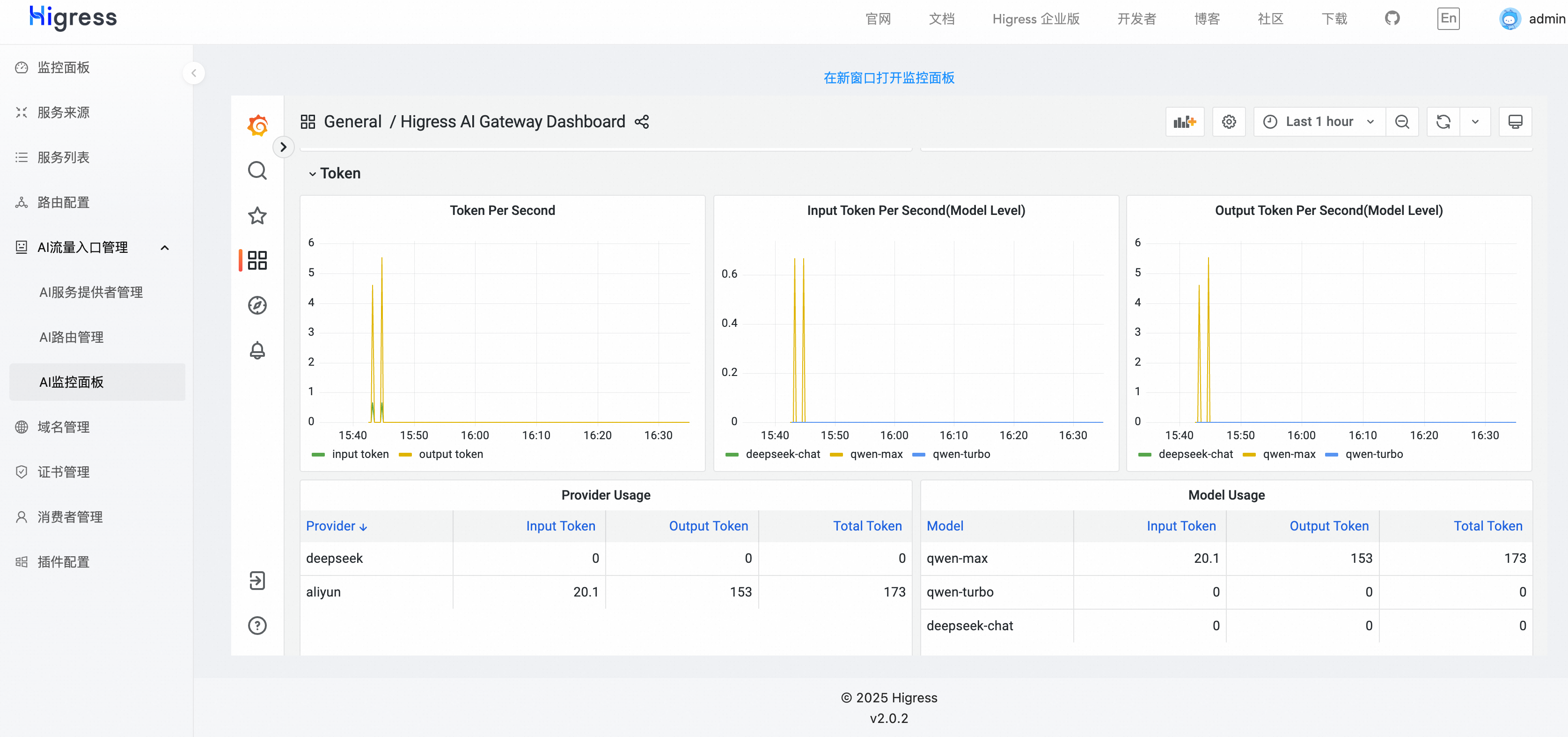 在AI监控面板界面,可以对AI请求进行观测。观测指标包括每秒输入输出Token数量、各供应商/模型Token使用数量等。