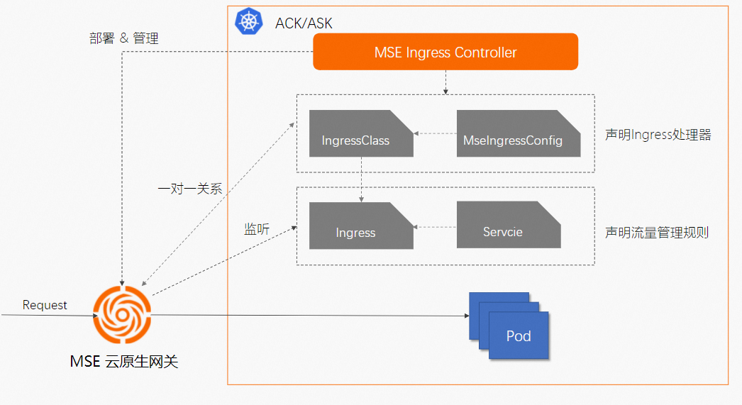- MSE Ingress Controller:不是网络数据平面,它是管理 MSE 云原生网关实例以及配置的控制平面。即 MSE Ingress Controller 不处理任何业务请求流量,它位于流量旁路,管理着处理业务流量的 MSE 云原生网关实例。