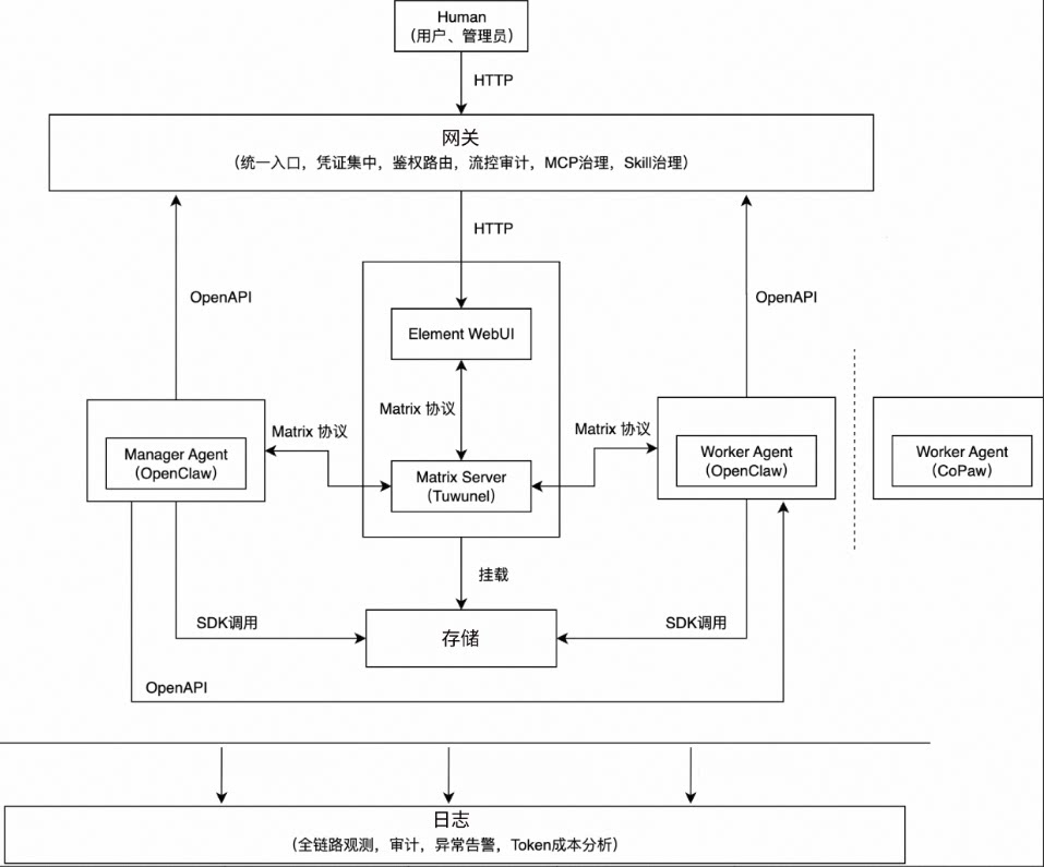 - 使用 Element IM 客户端+Tuwunel IM 服务器(均基于 Matrix 实时通信协议),通信协议和原生的不同,节省钉钉、飞书 IM 的接入和企业内的审批成本,方便用户快速体验在 IM 的交互环境中体验模型服务的“爽感”,同时支持以 OpenClaw 原生的方式接入 IM。
