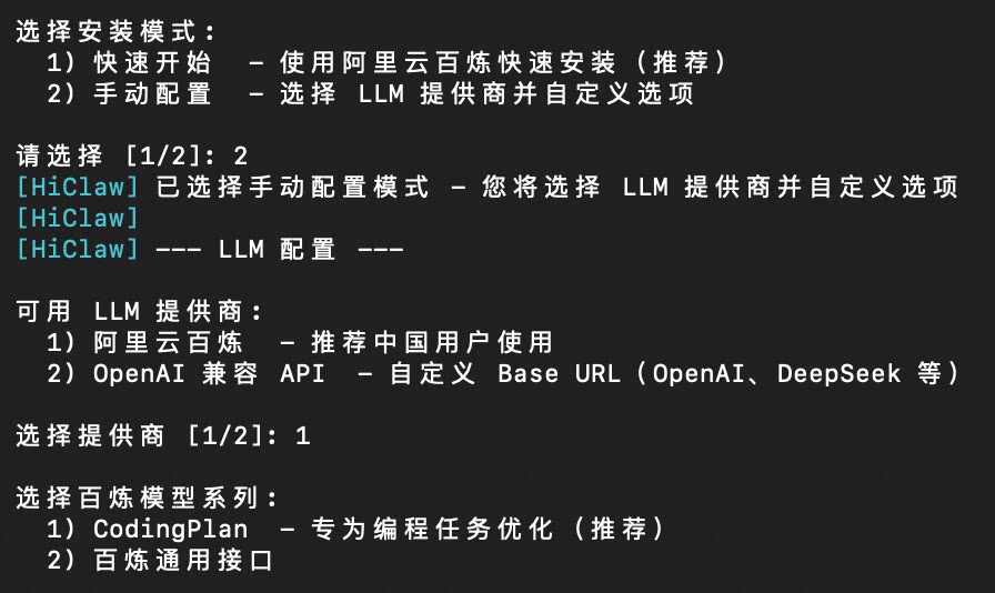 HiClaw 配置过程中,模型服务接入的默认选型是百炼 Coding Plan。每个 Worker 龙虾的模型服务,可以通过 Manager 龙虾来进行分配,也可以在 Higress 控制台进行配置。
