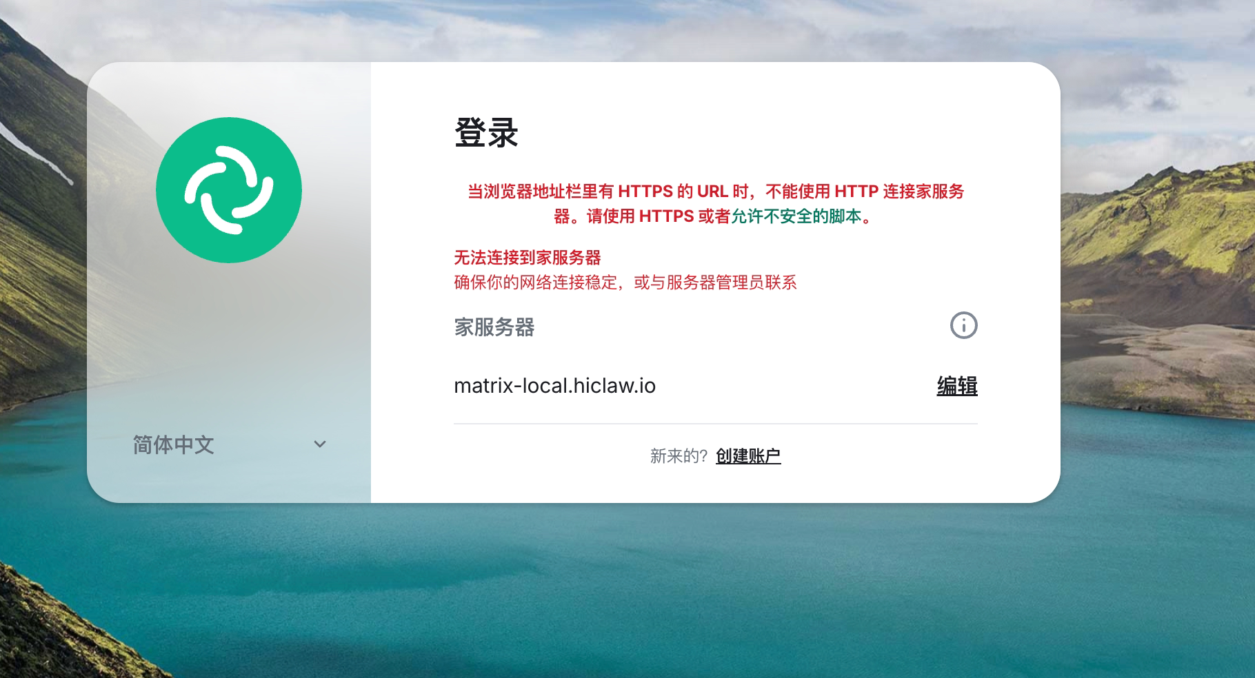 默认配置的 Matrix Server 域名解析到 localhost,在其他电脑上无法连通。登录 Element Web 时,需要将 Matrix Server 地址改为: