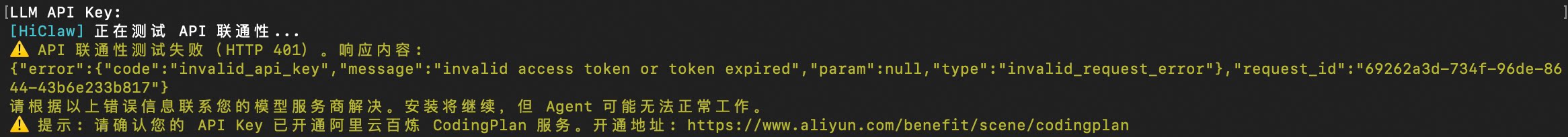 检查 HiClaw 安装过程中,API 联通性是否通过。未通过如下: