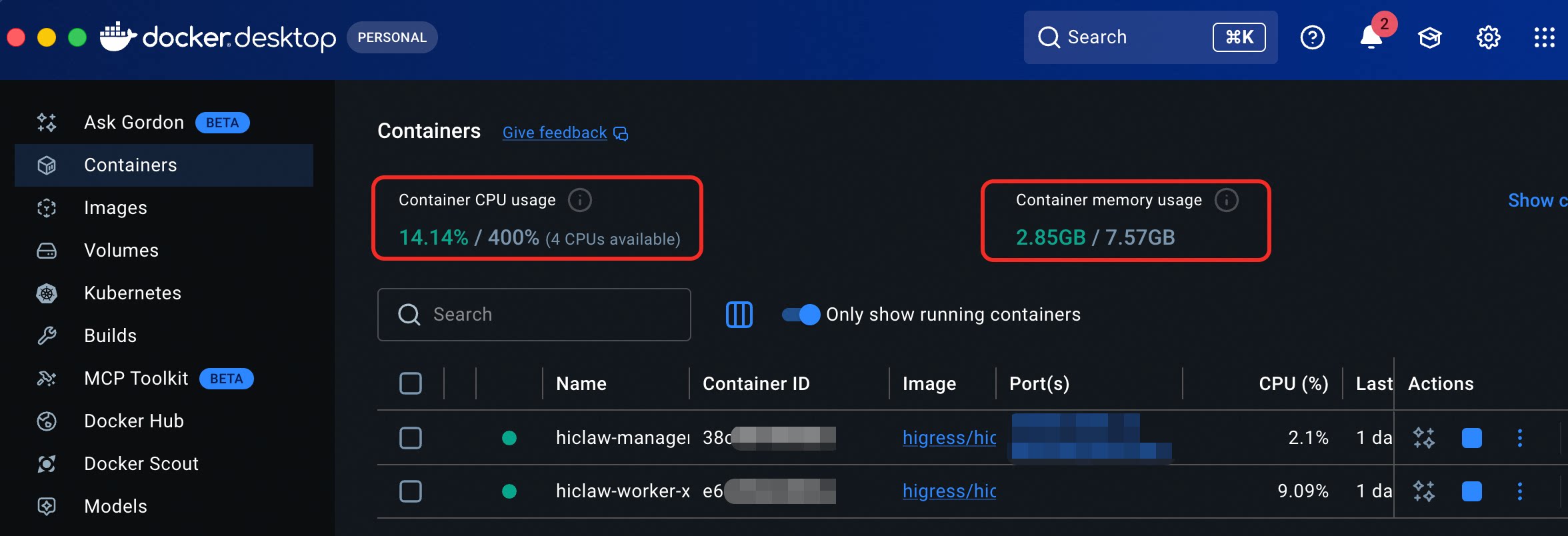 - 最低 2C GB 内存。如果希望部署较多 Worker 体验更强大的 Agent Teams 能力,建议 4C8GB 内存。OpenClaw 内存占用较高,Docker Desktop 用户可在 Settings → Resources 中调整。