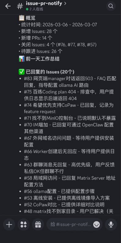 1、有问题,提 issue:每天10点和18点,HiClaw GitHub 会有一只龙虾,对所有 issue 进行答复。