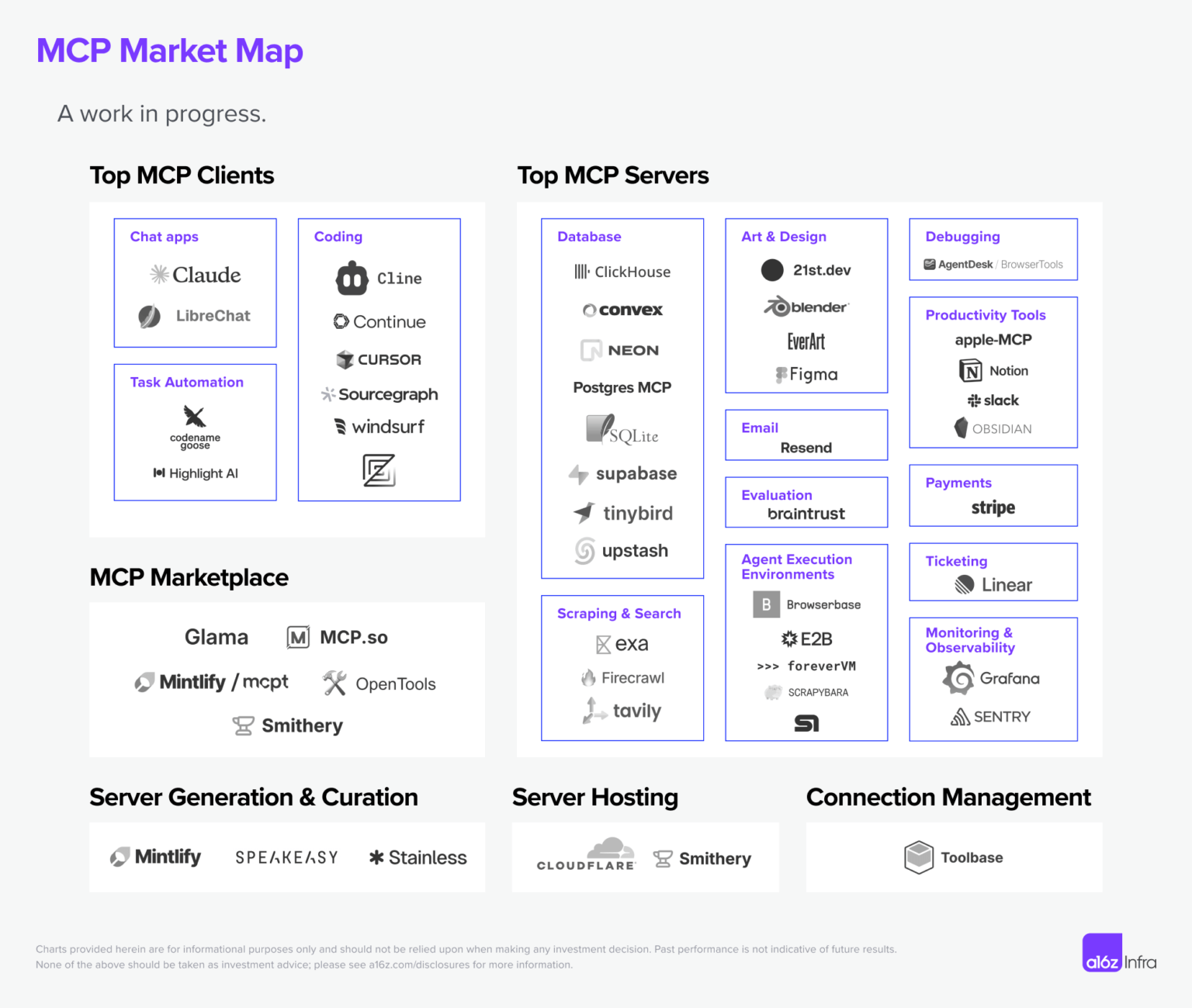 a16z Infra 团队绘制了一张 MCP Market Map_[3] _。这个图涵盖了 MCP 生态当今最活跃的领域,尽管仍有许多空白,但对国内的创新会带来诸多启发。