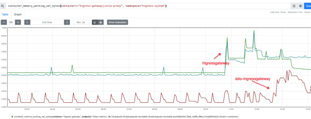 - 在同样配置下,Higress 使用内存较高。从监控可以看到,在相同配置下,Higress gateway 的内存使用明显比 istio-ingressgateway 要高。经过 Higress 社区同学精简 Higress gateway 的监控指标,两者也达到基本一致的资源使用。