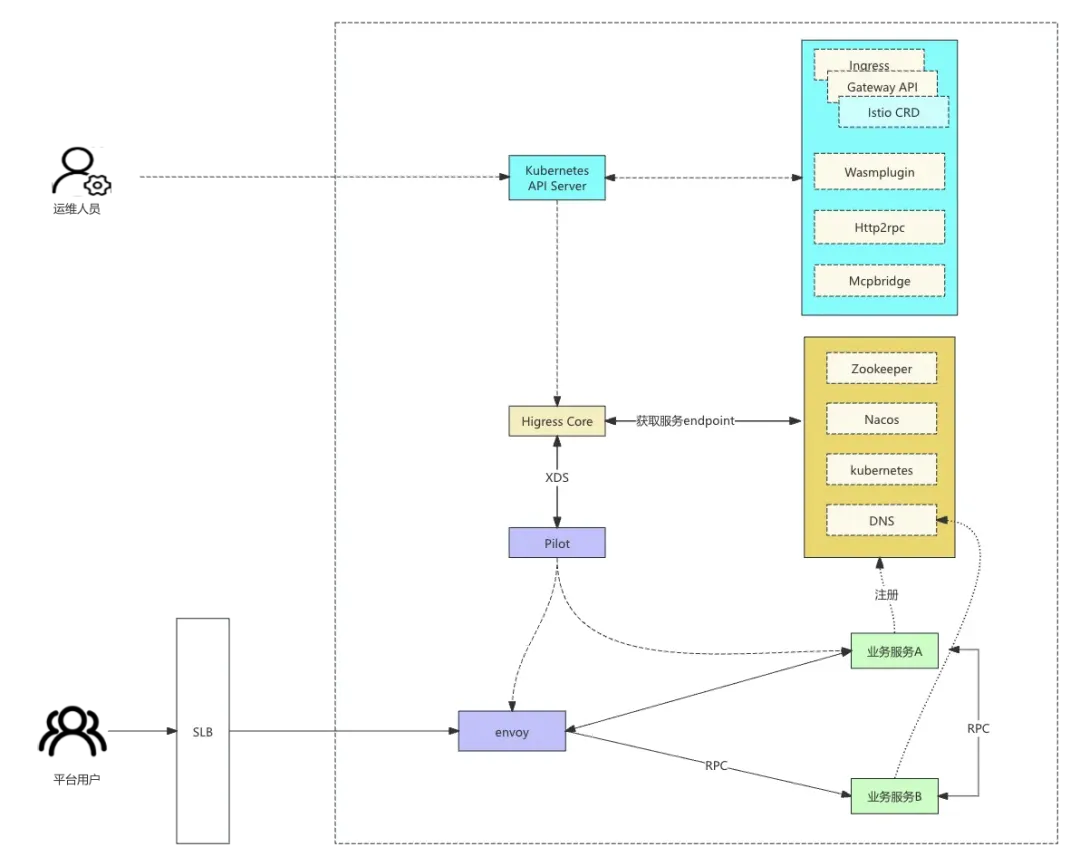 - 扩展功能。Higress 在多数据源这块集成了多种主流注册中心,这些能力可以直接复用,不用重复建设;基于 envoy filter 提供了 http2rpc 的能力,并封装了单独的CRD, 方便 http2dubbo 的配置。