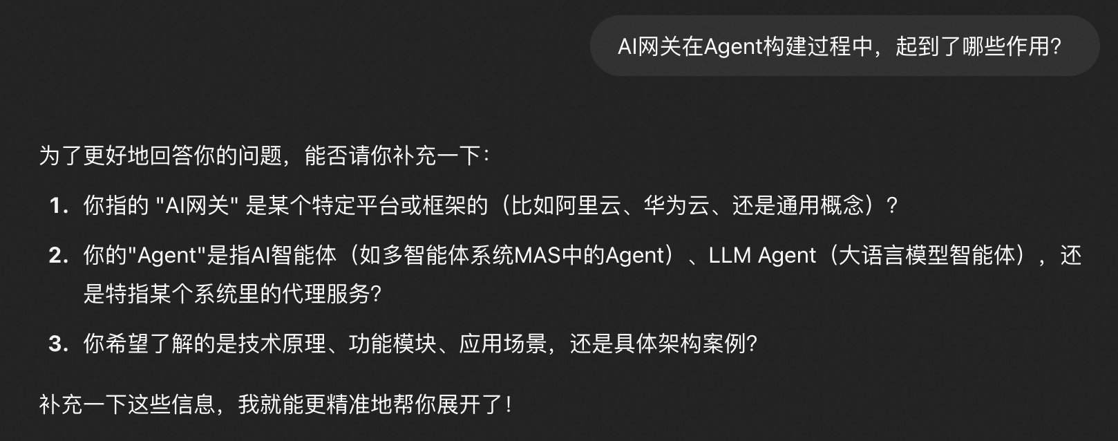 当我提问:AI 网关在 Agent 构建过程中,起到了哪些作用?显然这个任务描述的不够明确。于是,大模型给出了描述更加明确的方式,如下。