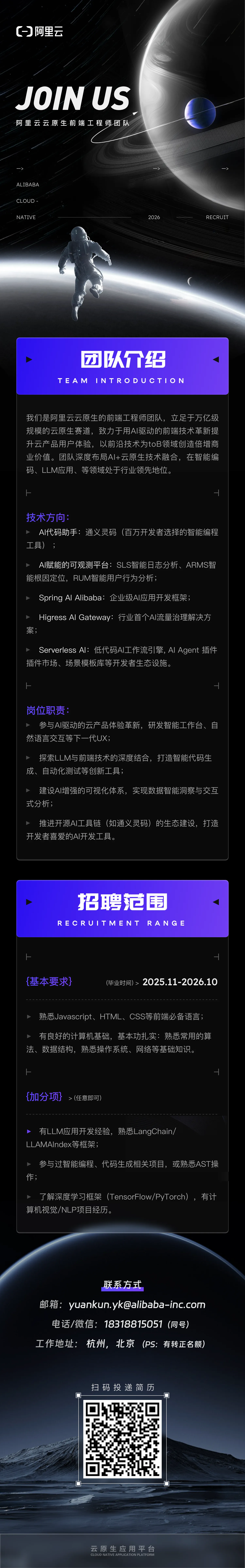 我们是阿里云云原生前端工程师团队,立足于万亿级规模的云原生赛道,致力于用 AI 驱动的前端技术革新提升云产品用户体验,以前沿技术为 toB 领域创造倍增商业价值。团队深度布局 AI+云原生技术融合,在智能编码、LLM 应用、可视化 AI 等领域处于行业领先地位。