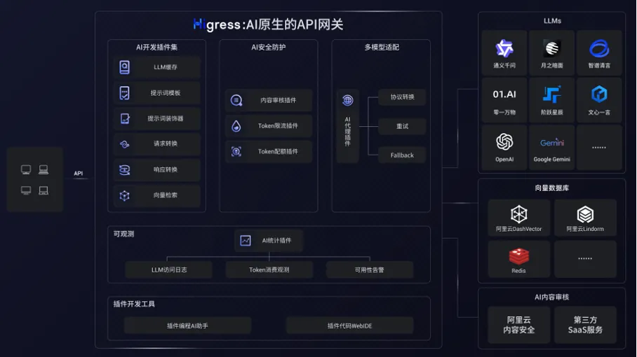 在 AI 生态方面与扩展性方面,通过 Wasm 插件机制,云原生 API 网关在插件市场中提供了多达 15 种 AI 相关插件,覆盖了大模型代理、敏感数据检测、内容安全审计、自定义统计、Token 限流等场景,实现了各种 LLM 的接入以及阿里云内容安全、redis、向量检索服务等云服务的集成,通过灵活组合这些插件,既能满足我们在大模型场景下的基本需求又能根据不同细分业务场景设置不同的管控策略,并且插件市场还支持上传自定义插件,网关的可扩展性大大提高。