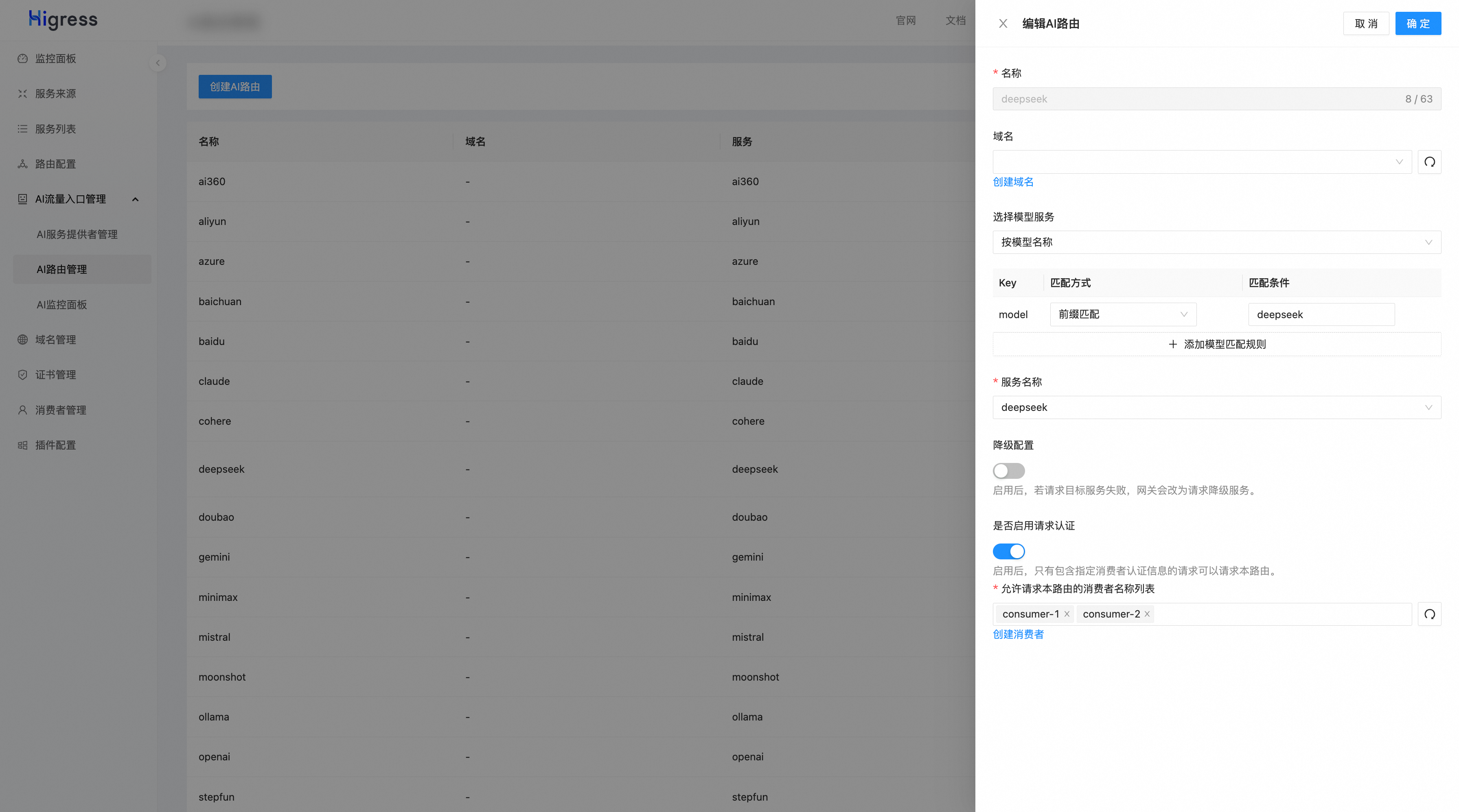 根据启动脚本提供的地址可以访问 Higress 控制台,Higress AI 网关内置了主流的 LLM Provider,仅需要在控制台上简单填写APIKey即可完成 provider的配置,例如配置 deepseek provider: