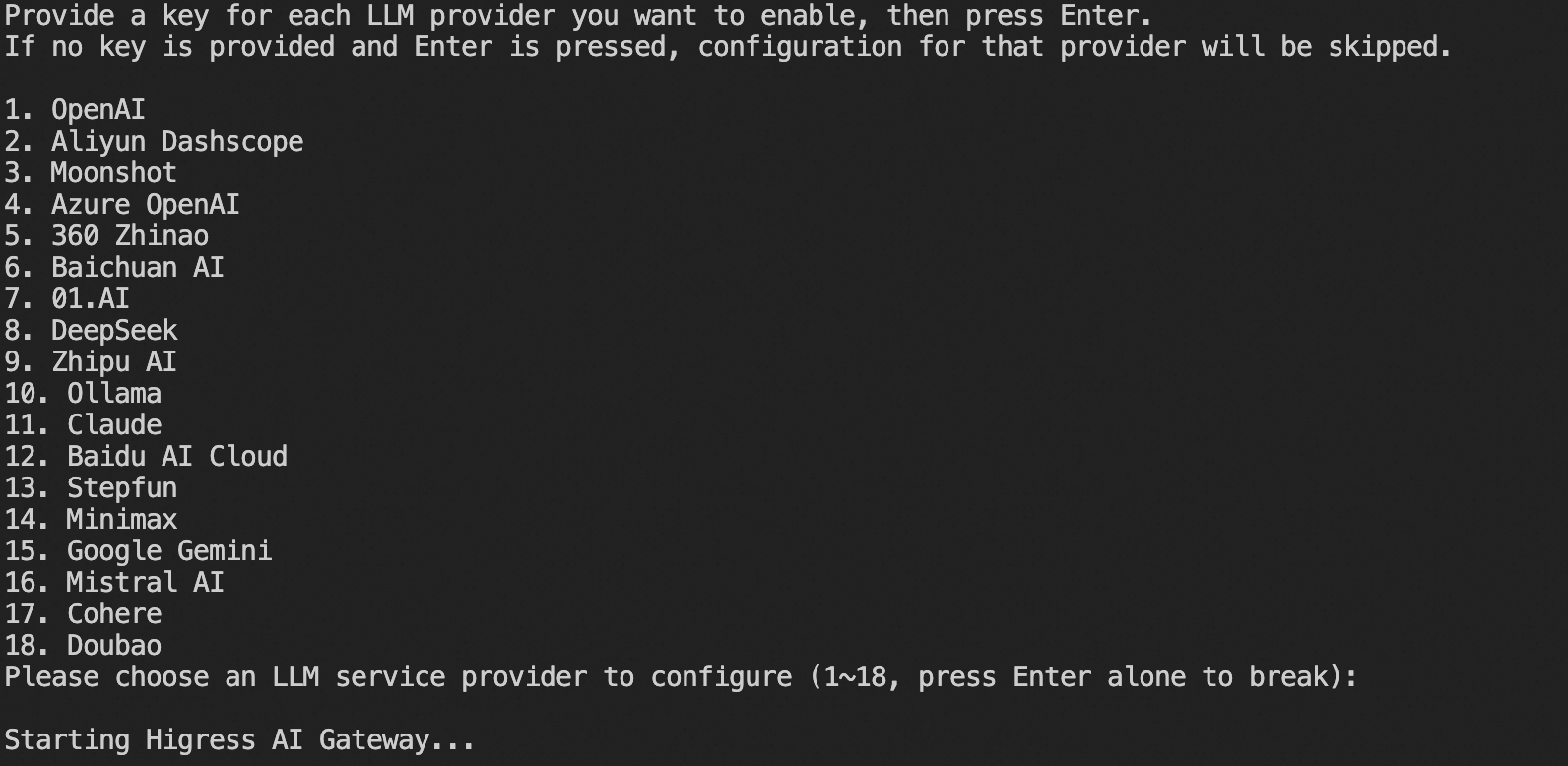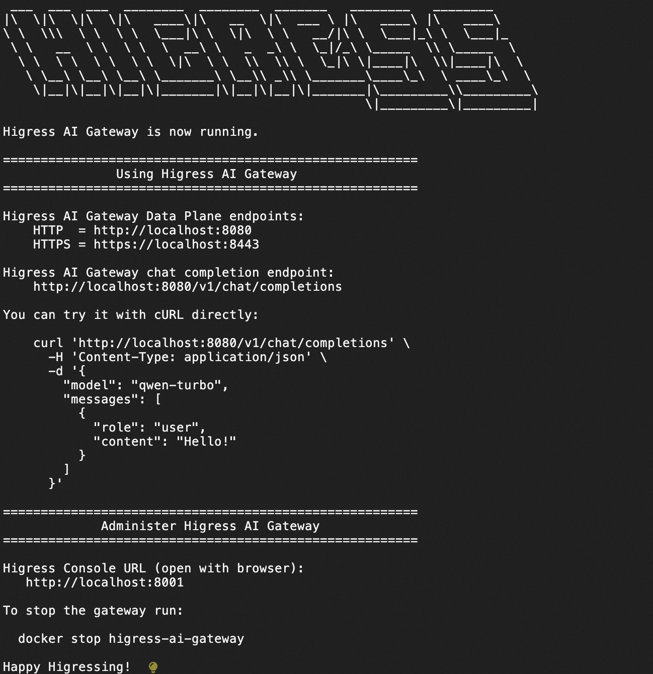 curl -sS https://higress.cn/ai-gateway/install.sh | bash注意:AI 网关的启动过程需要访问公网资源。请确保其运行环境具备外网访问条件。