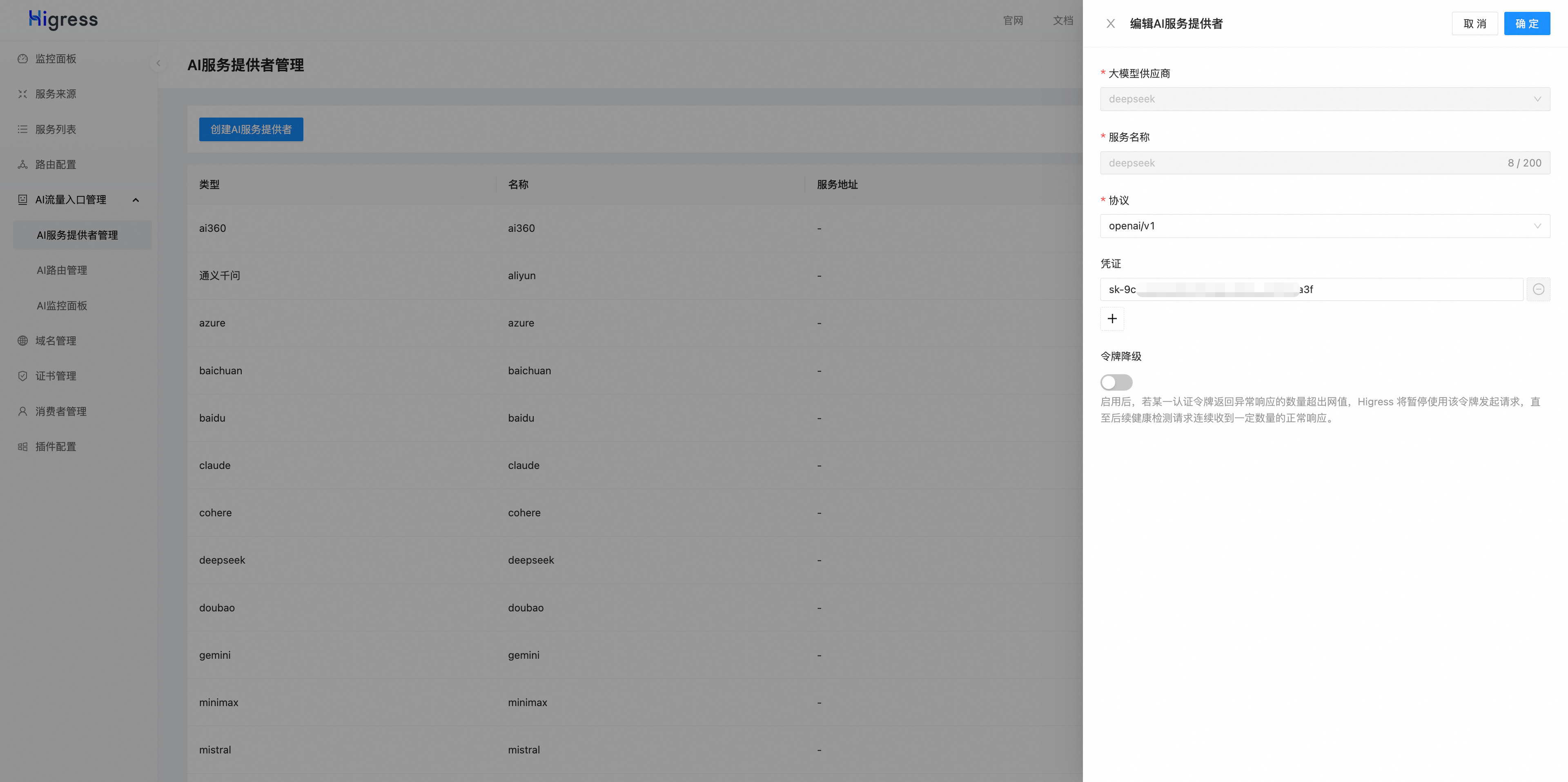 根据启动脚本提供的地址可以访问 Higress 控制台,Higress AI 网关内置了主流的 LLM Provider,仅需要在控制台上简单填写APIKey即可完成 provider的配置,例如配置 deepseek provider:
