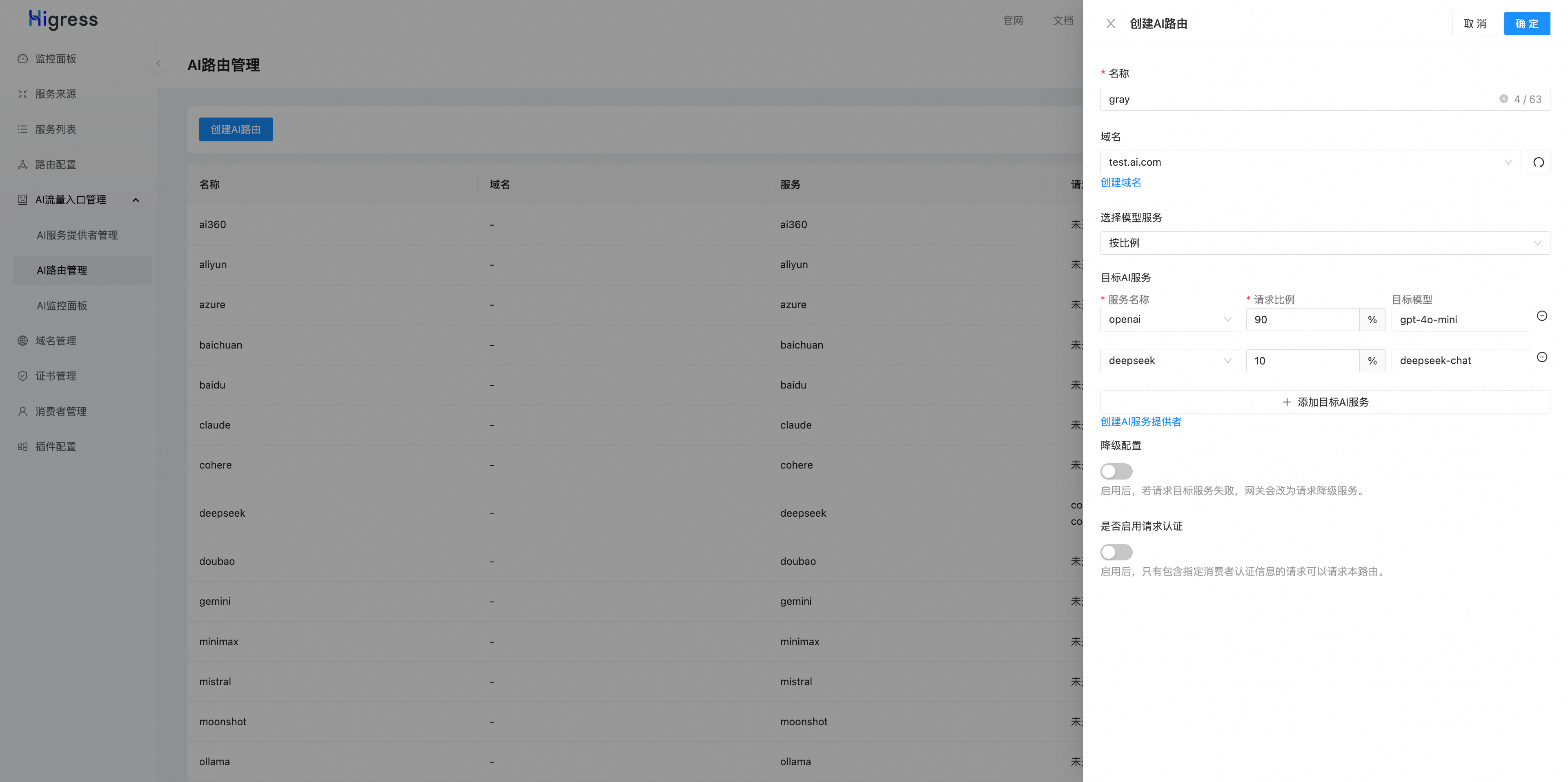 网关支持模型按比例灰度能力,便于用户在模型间迁移,如下图所示,请求流量将有90%被路由到 openai,10%被路由到 deepseek。