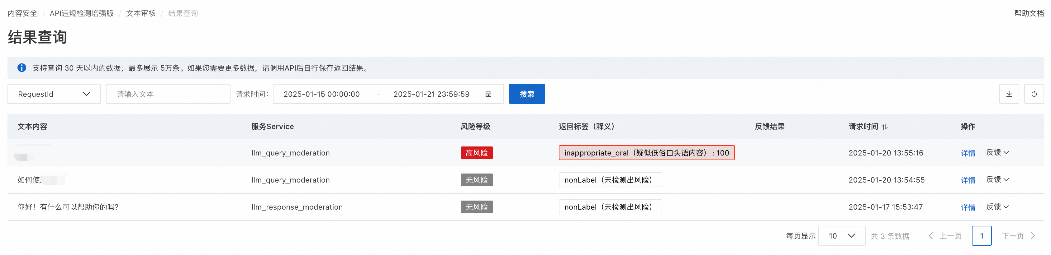 { "id": "chatcmpl-E45zRLc5hUCxhsda4ODEhjvkEycC9", "object": "chat.completion", "model": "from-security-guard", "choices": [ { "index": 0, "message": { "role": "assistant", "content": "我不能处理隐私信息" }, "logprobs": null, "finish_reason": "stop" } ], "usage": { "prompt_tokens": 0, "completion_tokens": 0, "total_tokens": 0 }}同时,在内容安全控制台可以查看每一个请求的审计日志: