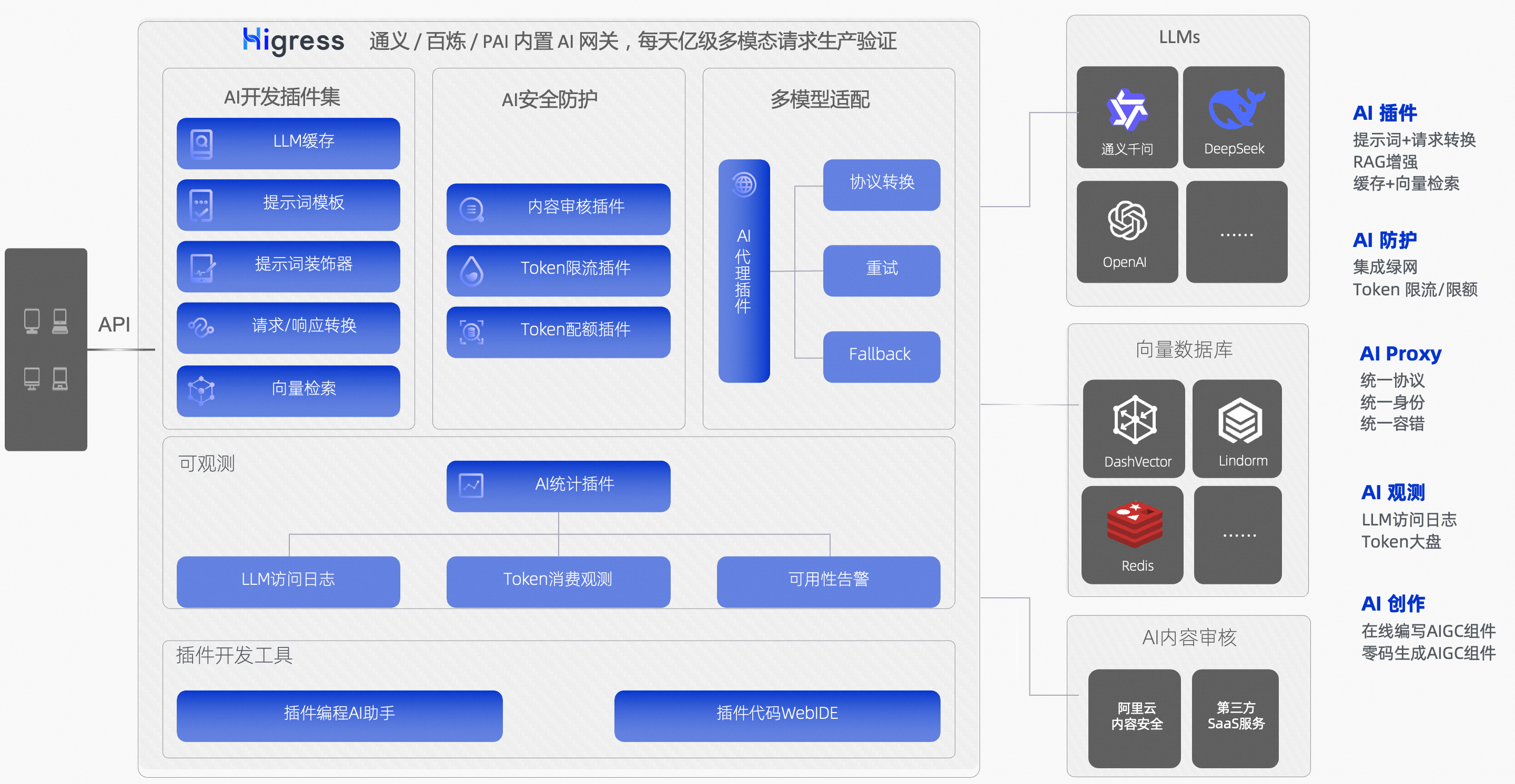 云原生API网关对接了阿里云内容安全,能够做到对大模型请求/响应的实时处理与内容封禁,阿里云内容安全通过了信通院的认证,能够提供强有力的 AI 内容安全保障。