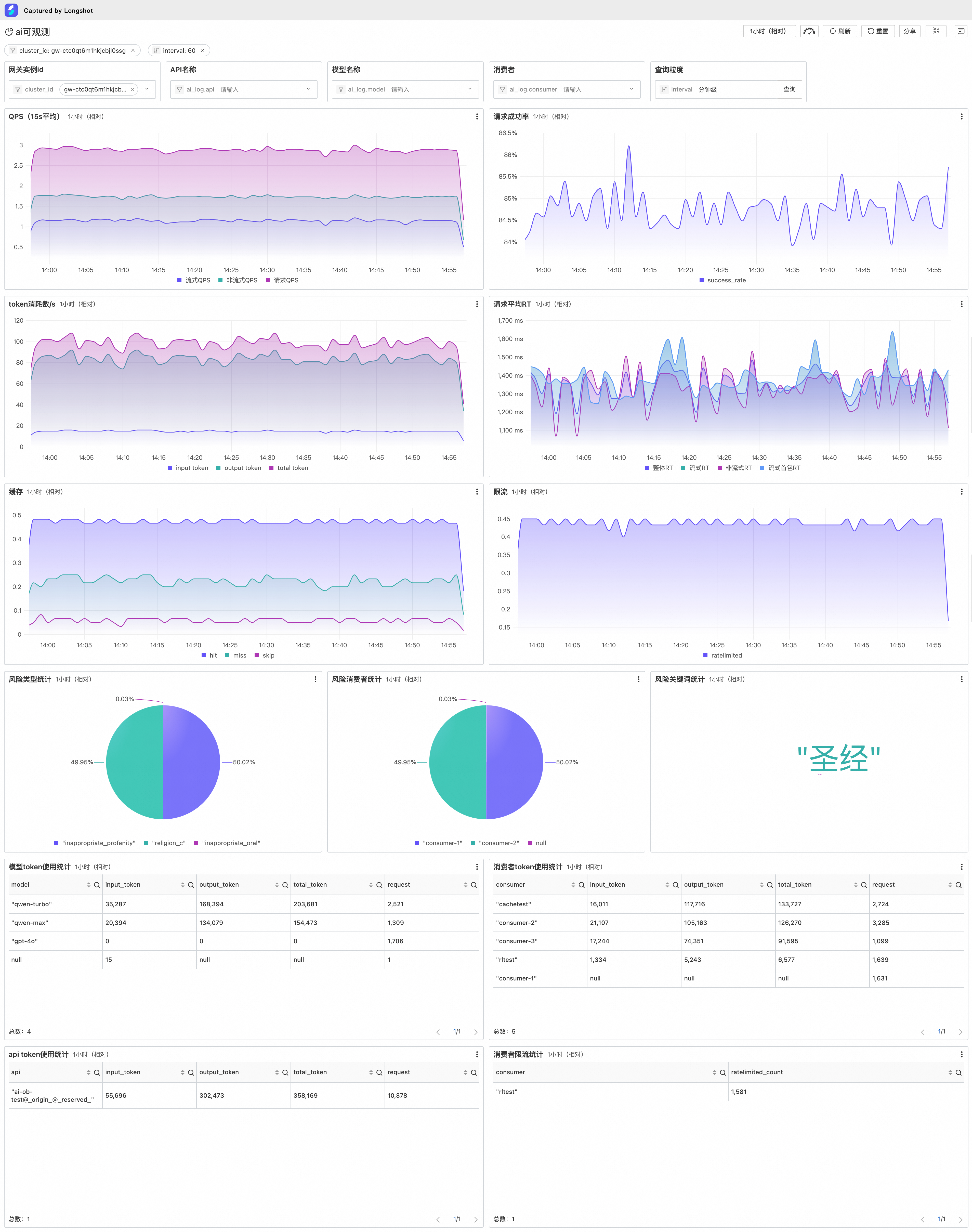 基于云原生 API 网关的消费者鉴权能力支持模型服务的分租,用户可以像模型服务商一样在网关上签发自己的 API Key 供用户使用,并能够控制消费者的调用权限和调用额度,配合可观测能力,还可以对每个消费者的 token 用量进行观测统计。