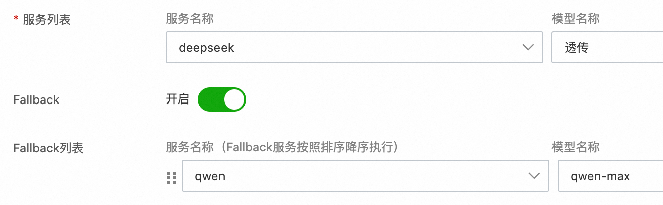 如图,配置了 DeepSeek 的服务,Fallback 策略为调用 qwen-max。