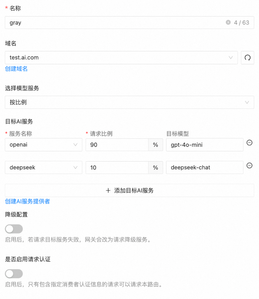云原生 API 网关支持模型按比例灰度能力,便于用户在模型间迁移,如下图所示,请求流量将有90%被路由到 openai,10%被路由到 DeepSeek,后续灰度的切换也只需修改配置并发布,不需要做任何代码层级的变更。