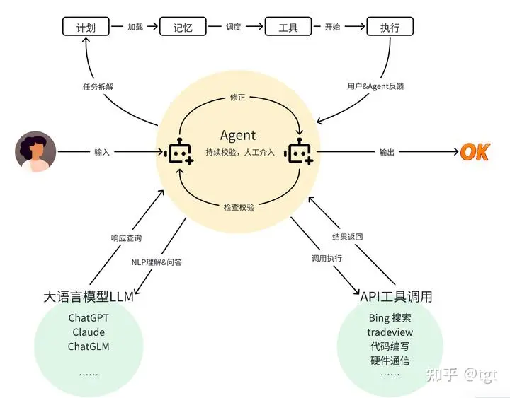 说回 Agent,相比对话机器人,Agent 的 planing 和执行过程更加复杂,会消耗更多 token,下方是来自知乎作者@tgt 制作的图,从中我们可以看到,从输入开始,Agent 的计划、记忆、调用外部系统、执行输出,这些过程都会唤醒大模型,从而消耗 token,如果在输出内容前,再添加自我纠错的过程,以提升输出效果,token 更会成本增加。