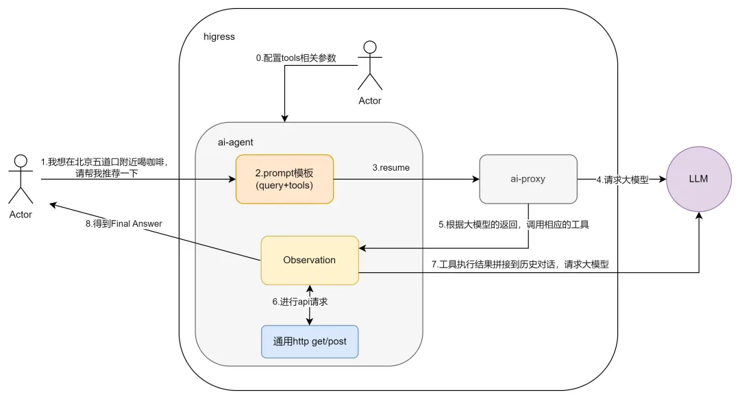 MCP 出现之前,Agent 需要借助 tool 去对接外部系统,planning 的任务越复杂,调用的外部系统数量和次数会越多,会带来很高的工程化成本。以下方的 Higress AI Agent 的流程图为例,当用户发出“我想在北京五道口附近喝咖啡,请帮推荐一下”,Agent 需要通过 tool 调用高德、点评的 API,若引入模型自我矫正过程,调用频次会进一步增加。