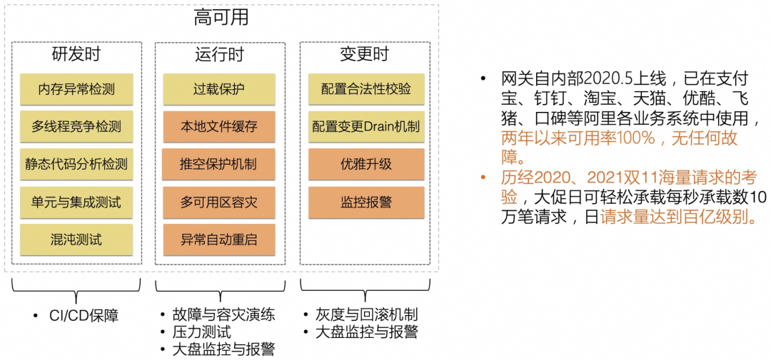 1. 云原生网关孵化自阿里内部,经过历年大促的验证,积累了一套高可用保障方案,从研发时、运行时、变更时来控制风险提升稳定性,在每个阶段各自有手段去保证其高可用目标。