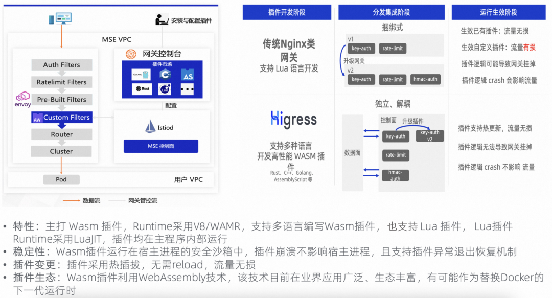 2. 可扩展性对于软件的重要性毋庸置疑,相比 APISIX 使用的 Lua 扩展机制,云原生网关既可以支持 Lua 扩展,同时也支持 Wasm(WebAssembly)扩展,Wasm 插件天然支持 C++、Rust、Golang、JS 等多语言编写,原生提供插件热插拔与插件配置热更新能力,毫秒级生效,配置变更对长连接无损,且 Wasm 插件运行在安全沙箱中,插件自身的漏洞或者异常崩溃不会影响网关宿主进程,对于异常崩溃的插件也提供了自恢复机制,无需人工干预。