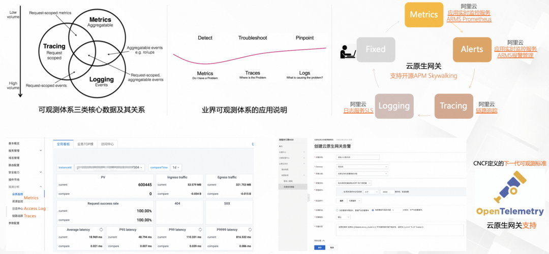 尤其是可观测方面,云原生网关提供了丰富的可观测数据,包括流量全局看板、日志检索、业务 TOP 榜、延迟/失败率/错误码等多种响应指标等,并辅以报警管理,使运维人员对服务的整体状态及异常情况尽在掌握。