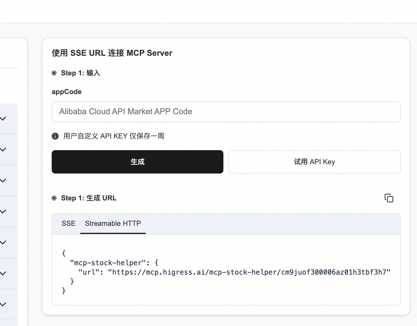 在 mcp.higress.ai 登陆后,可以进入页面直接复制右侧生成的 URL,我们同时提供了 SSE 接入点和 Streamable HTTP 接入点,支持根据使用的客户端情况按需接入。