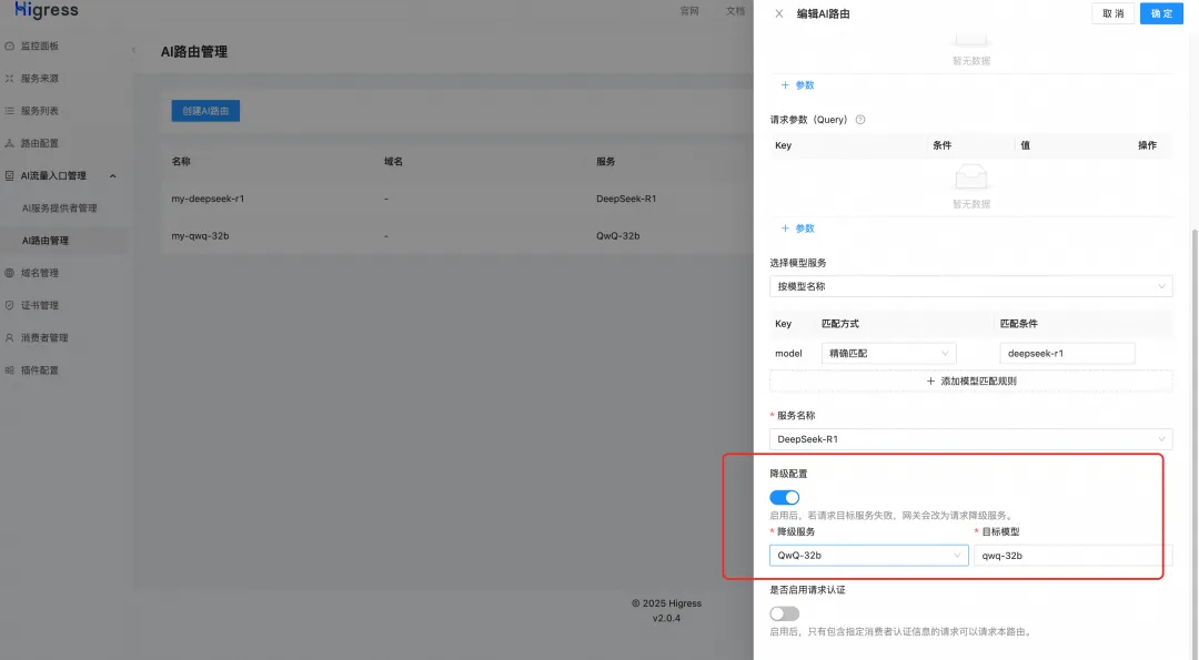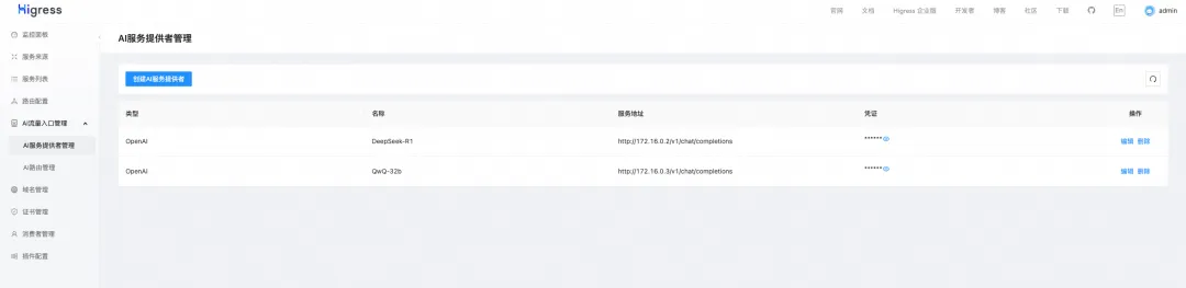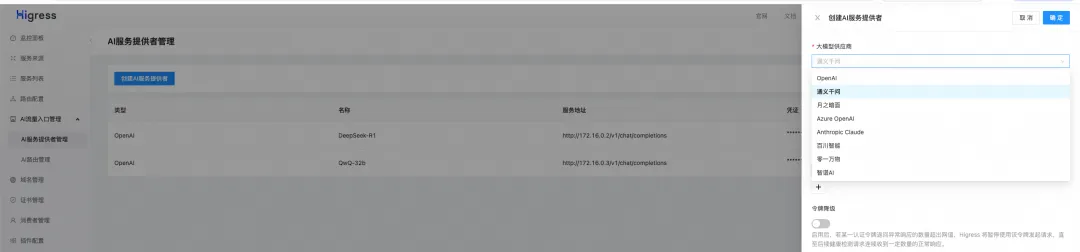 1)在 Higress 控制台分别配置 DeepSeek-R1 和 QwQ-32b 的接入方式: