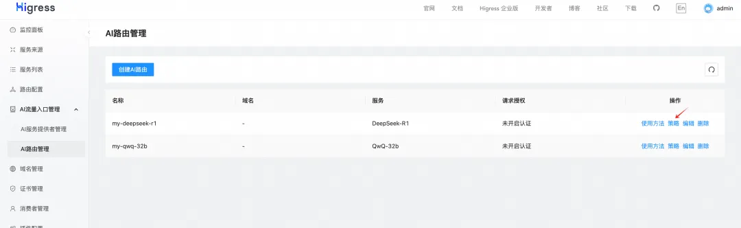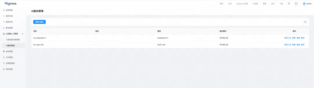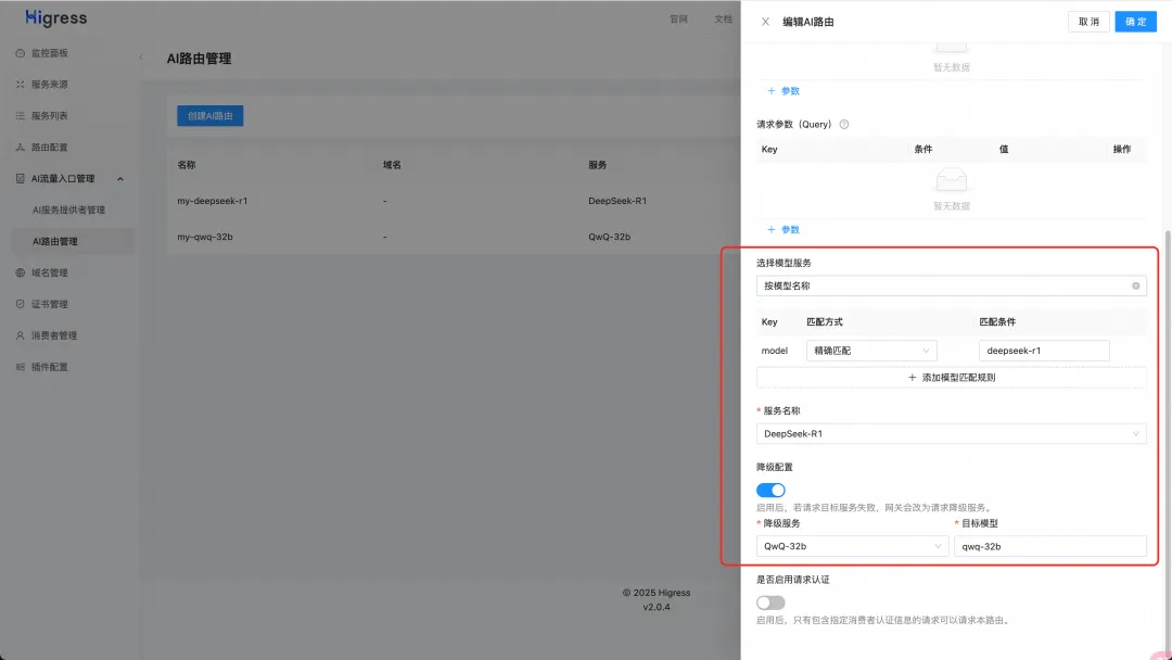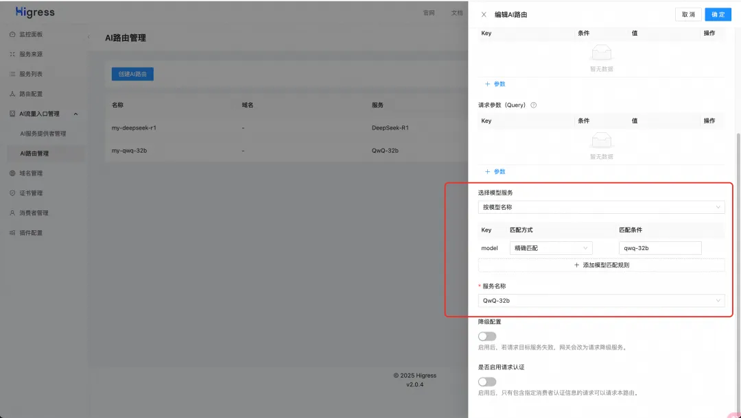 2)在 Higress 控制台创建路由,按照匹配模型名称的路由规则转发给两个不同的模型。