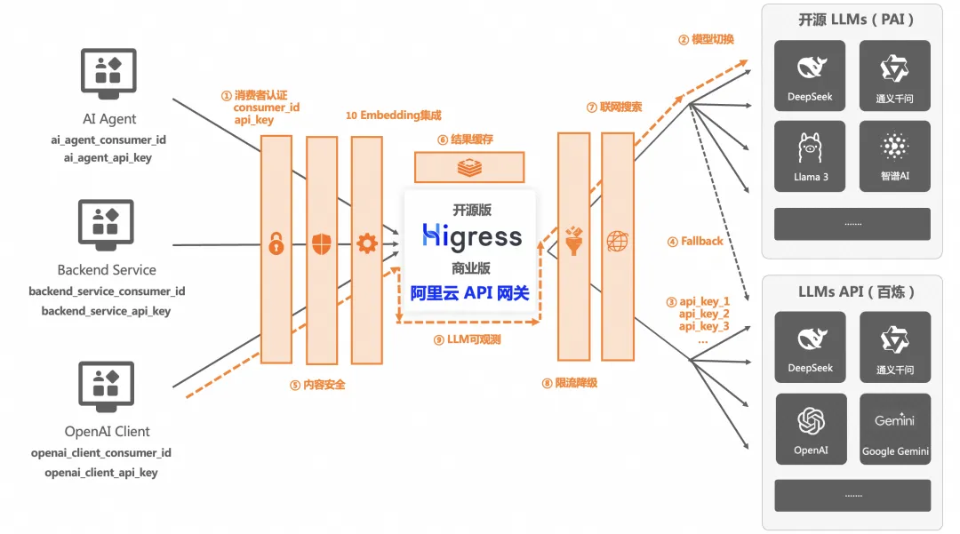 多模型服务只是 Higress AI 网关的基本能力之一,其他进阶能力还包括消费者鉴权、模型自动切换等,可以集中解决用户遇到的以下三类问题: