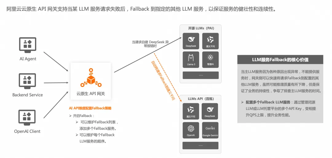 AI 网关支持当某个大模型服务请求失败后,Fallback 到指定的其他大模型服务,以保证服务的健壮性和连续性。
