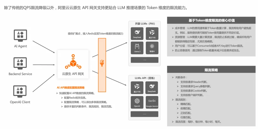- 提升资源管理:大模型对计算资源的消耗不可控,限流可以防止系统过载,确保所有用户都能获得稳定性能,尤其在高峰期。