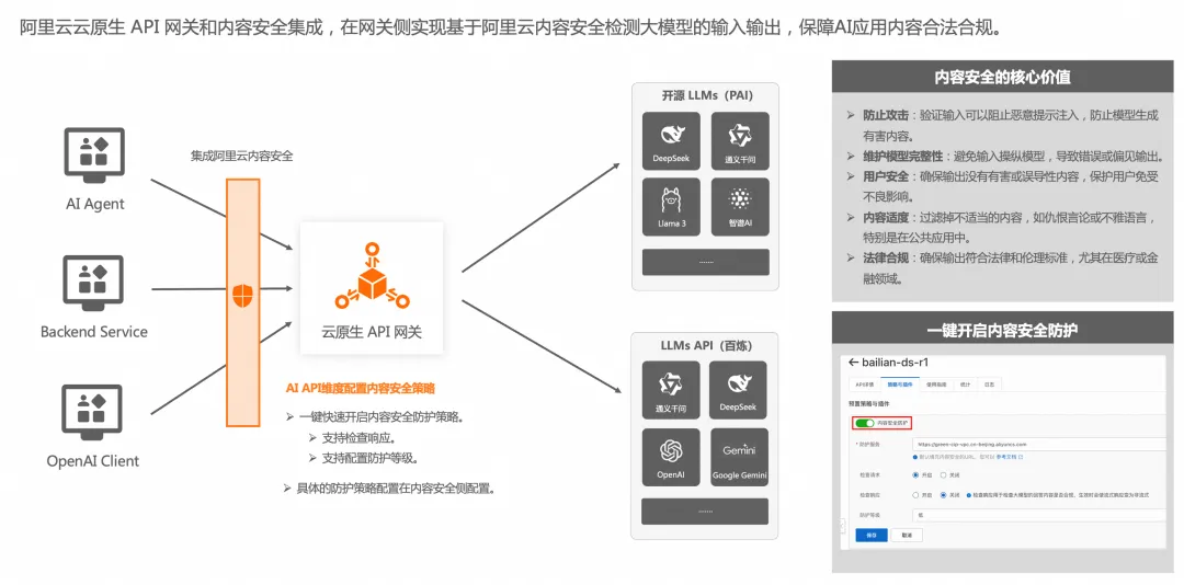 AI 网关接入了阿里云内容安全,对面向大语言模型的输入指令和生成文字分别提供审核服务。包括: