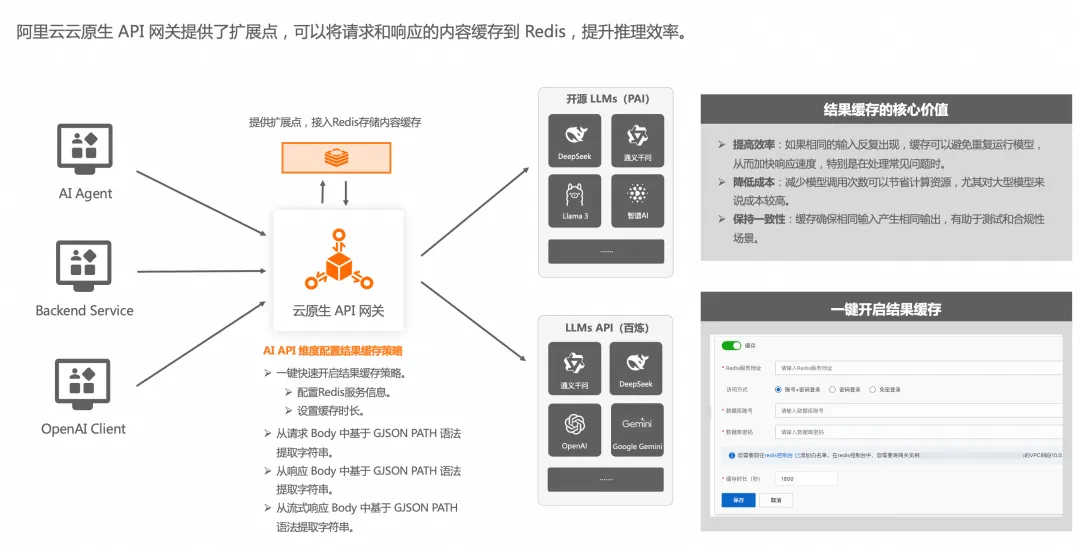 AI 网关提供了扩展点,可以将请求和响应的内容缓存到 Redis 中,并支持配置 Redis 服务信息、设置缓存时间。