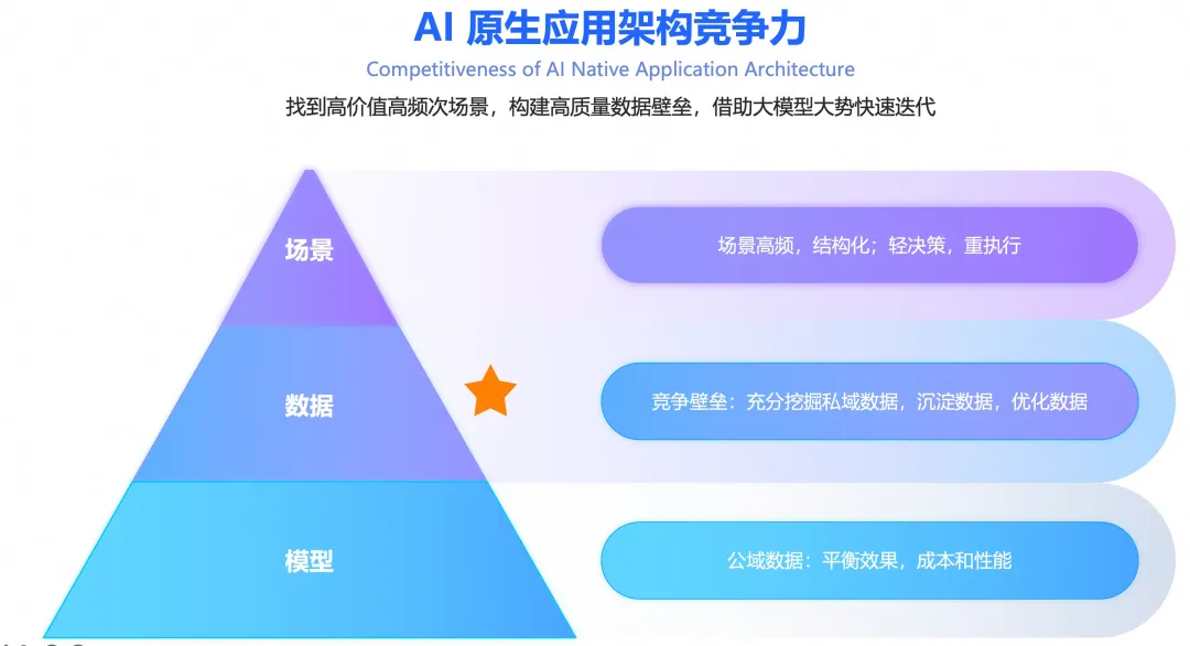 - 当大家突破了场景,竞争对手一定会跟上来,最终我们 AI 应用壁垒会在自己的数据上面,如何私域数据,沉淀数据,优化数据,就是 AI 应用的护城河。