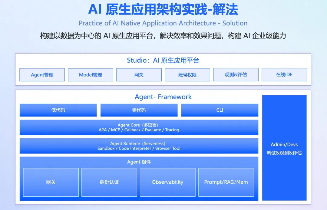 为了解决上面问题,我们需要构建一个简单、易用、专业的开发框架,提升研发效率。构建一个以数据为中心的 Agent 开发平台,通过 调试、观测、评估一体化解决 Dev 阶段调试效率和效果问题。构建 AI 原生应用开发平台(通过 AI 网关解决多模型超时重试、Failover、灰度、Token 流控和额度管理提升模型稳定性;通过 AI 网关接入安全护栏无侵入解决安全合规问题;通过 AI 网关语义缓存,智能路由,AI 消息解决成本问题;通过 Serverless平台解决极致弹性问题;通过端到端可观测&评估体系解决排查难,效果追踪问题)解决 Ops 阶段难以维护问题。