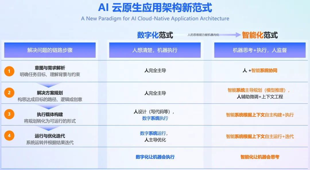 由此可见,AI 原生应用架构是一次智能化范式升级,让机器学会了思考。