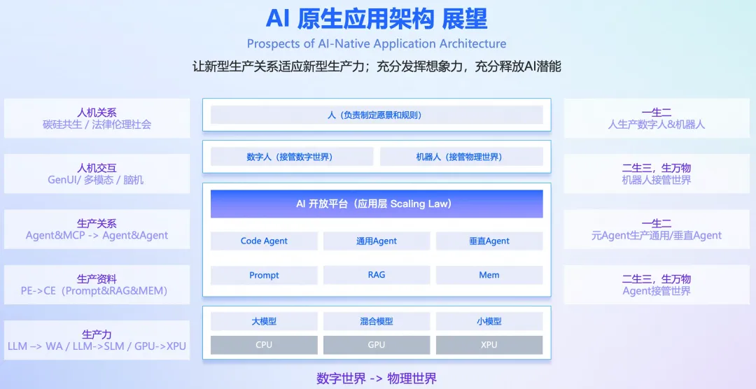 - 右边是 AI 原生架构,解决智能化问题,构建各种助手,人机交互通过多模态感知自主完成任务。