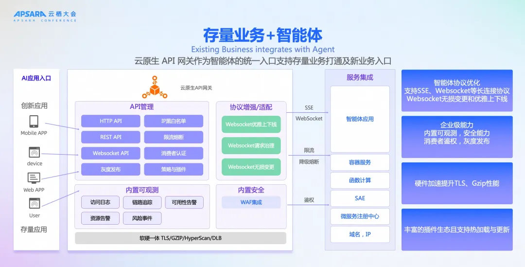 阿里云云原生 API 网关正是针对这一场景而设计:它通过协议适配、流量治理、内置安全和可观测能力,将传统 API 平滑地转化为智能体可消费的服务,从而帮助企业低成本实现智能化升级。它具备: